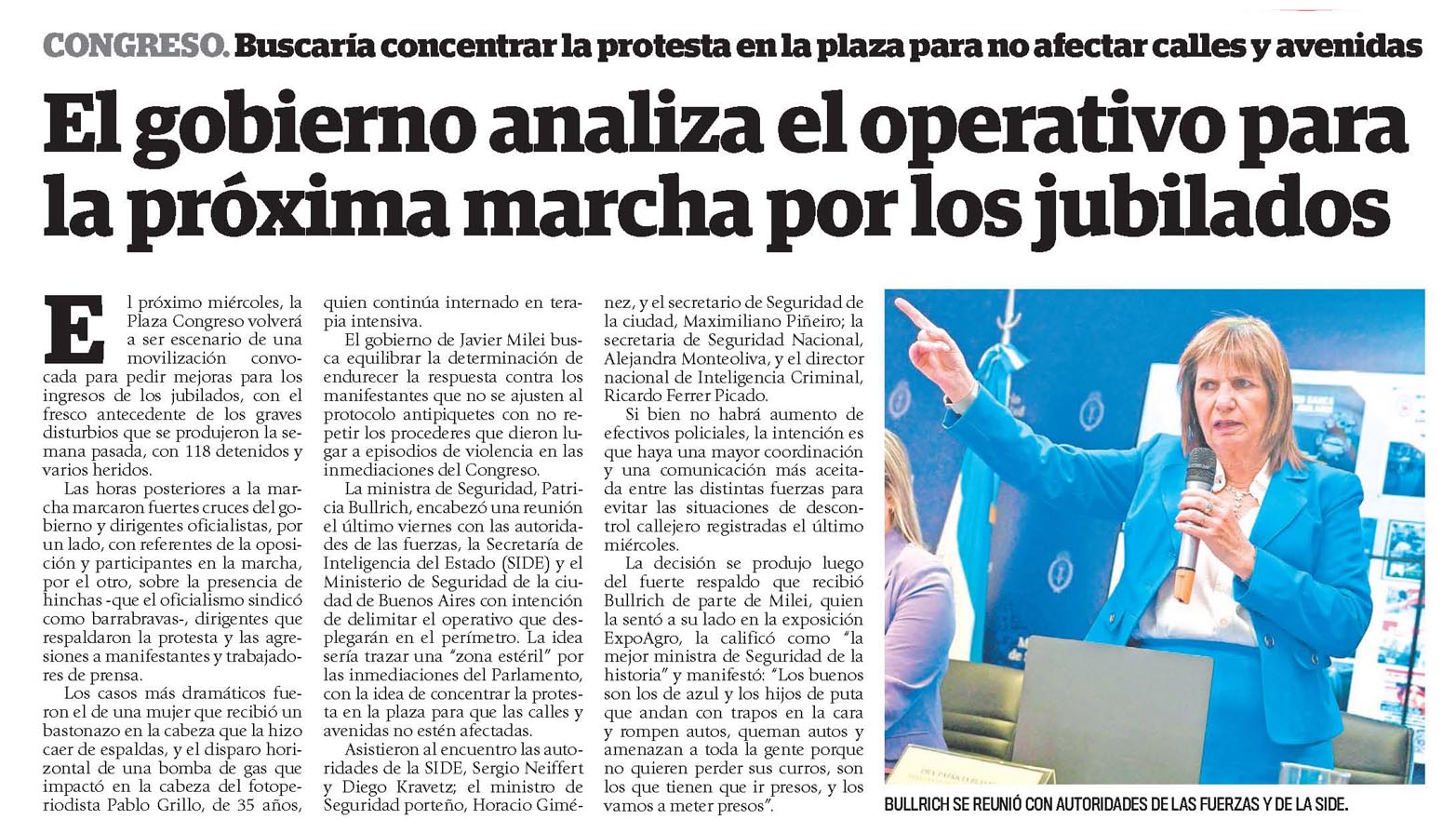 … último miércoles. La decisión se produjo luego del fuerte respaldo que recibió Bullrich de parte de Milei, quien la sentó a su lado en la exposición ExpoAgro, la calificó como «la mejor ministra de Seguridad de la historia» y manifestó: «Los buenos son los de azul y los hijos de puta que andan con trapos en…