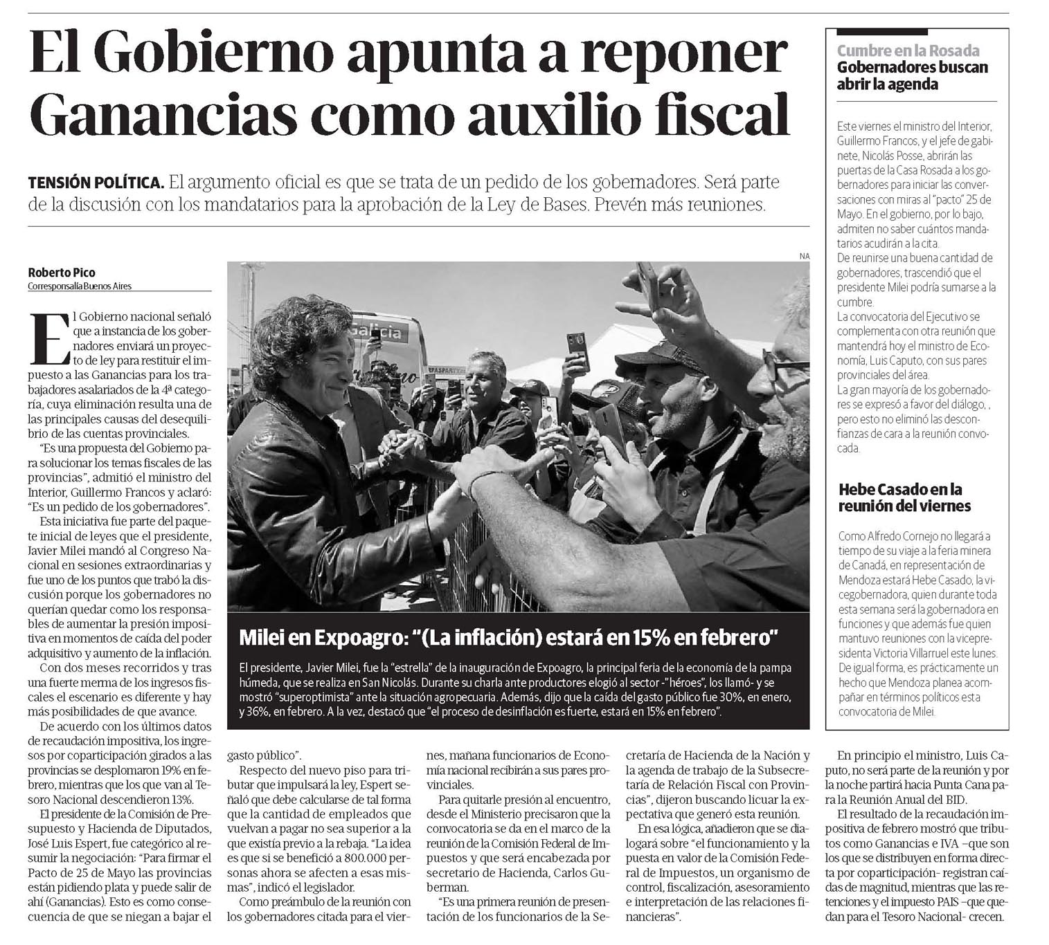 El Gobierno nacional señaló que a instancia de los gobernadores enviará un proyecto de ley para restituir el impuesto a las Ganancias para los trabajadores asalariados de la 4ª categoría, cuya eliminación resulta una de las principales causas del desequilibrio de las cuentas provinciales.