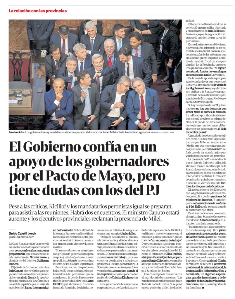 Pese a las críticas, Kicillof y los mandatarios peronistas igual se preparan para asistir a las reuniones. Habrá dos encuentros. El ministro Caputo estará ausente y los ejecutivos provinciales reclaman la presencia de Milei.gcarelli@clarin.comLa Casa Rosada todavía no envió las invitaciones a los gobernadores para convocarlos a las reuniones preparatorias que encabezarán el jefe de Gabinete, Nicolás Posse, y el ministro del Interior, Guillermo Francos.El jefe de la Cartera económica, Luis Caputo, el otro vértice para negociar con los mandatarios provinciales un alivio fiscal y la aprobación del núcleo de la Ley Ómnibus, no será de la partida por su viaje a la asamblea del Banco Interamericano de Desarrollo. Sobre el final de la jornada, Francos confirmó finalmente que los ejecutivos de las provincias se dividirán en al menos dos grupos, entre viernes y lunes o martes.»Haremos dos o tres reuniones con grupos de gobernadores para después juntarlos», señaló el ministro político. Además convocarán a los jefes de los bloques legislativos.Funcionarios con despacho en Balcarce 50 imaginaban que los gobernadores del peronismo que se opusieron a la Ley de Bases no serían de la partida. Sobre todo, Axel Kicillof, que al cierre su discurso frente a la Asamblea Legislativa bonaerense se refirió a las negociaciones que autorizó Javier Milei.»Después de someter al pueblo, a la democracia y al federalismo a una agresión tan inédita como salvaje, ahora se nos lanza una invitación que se parece más a una amenaza (?) Cuenten con nosotros para reuniones de trabajo, para encuentros destinados a solucionar problemas, incluso para debatir (?) Si se trata de encuentros para fotos y marketing, arranquen nomás si no llegamos», señaló el gobernador preferido de Cristina Kirchner con sarcasmo.En la gobernación bonaerense se sorprendieron por las dudas alrededor de la presencia de Kicillof y ratificaron que el viernes estará presente, porque entienden que se trata de «un encuentro de trabajo».Descuentan que habrá una posición consensuada con el resto de los ejecutivos provinciales del PJ, como el formoseño Gildo Insfrán, el riojano Ricardo Quintela, el pampeano Sergio Ziliotto (que también anticipó su rechazo al Pacto de Mayo) y sus aliados de Tierra del Fuego y Santiago del Estero.Francos amplió la distancia con el mandatario bonaerense. «Las canchereadas están fuera de lugar.Todavía nadie lo invitó. Si se pone en esa posición, difícil invitarlo», señaló.El tucumano Osvaldo Jaldo ya se convirtió en un satélite libertario y el catamarqueño Raúl Jalil manifestó su apoyo a la negociación sin esperar la opinión de sus pares del peronismo.En cualquier caso, en el Gobierno no creen que la asistencia de los peronistas se traducirá en un respaldo al corazón de las reformas que el Gobierno quiere impulsar a cambio de un alivio fiscal para las provincias.En la Provincia, tampoco imaginan un acuerdo. «Si siguen recortando fondos no van a lograr consensos con nadie», advierten.En la Rosada apuestan que, para sancionar las leyes que necesita el Gobierno, alcanzará con la venia de los 14 gobernadores que ya le hicieron guiños a la Rosada y esperan luz verde de los oficialismos provinciales de Misiones, Río Negro, Santa Cruz y Neuquén.Si hay delegados de las 24 gobernadores no hay que descartar que Javier Milei se sume a la reunión.En la Rosada por ahora insisten en que no está previsto; lo mismo decían en la previa del único antecedente de una reunión entre el Presidente y los gobernadores, el 19 de diciembre pasado.Un puñado de gobernadores califica como «un destrato» la posibilidad de que Milei no se apersone.»Medio raro que nos convoque a todos y no esté, pero todo es raro», señala uno de los mandatarios provinciales que apoya los acuerdos.La presencia de Posse evidencia que el jefe de Gabinete tallará de ahora en más en la estrategia de la Rosada luego de las quejas de todo el arco político de que no existe un interlocutor confiable. El ministro coordinador ya había estrenado su nuevo rol el viernes, cuando recibió a los bloques del oficialismo.El acercamiento del Ejecutivo con los gobernadores, de todos modos, se explica por las gestiones del ministro del Interior. Y también por las observaciones de la número 2 del FMI que la semana pasada se entrevistó con Milei.En el lote del viernes no estarán el sanjuanino Marcelo Orrego y el mendocino Alfredo Cornejo, en Canadá en una feria de minería.»Hablaremos con algunos primero con otros después (?) Los gobernadores están preocupados por su situación fiscal a partir del recorte que se hizo durante la gestión anterior por el tema del impuesto a las Ganancias y la Nación está interesada en algunas normas que estaban dentro de la Ley de Bases», señaló Francos durante su visita a ExpoAgro. Como anticipó Clarín, el ministro se refiere a la reforma previsional, la reforma laboral, la desregulación hidrocarburífera y de minería, un régimen especial para grandes inversiones, y la delegación de facultades y las privatizaciones, ejes que integraban la ley ómnibus.En el recinto. Los gobernadores que asistieron el viernes pasado al discurso de Javier Milei ante la Asamblea Legislativa. FEDERICO LOPEZ CLARO