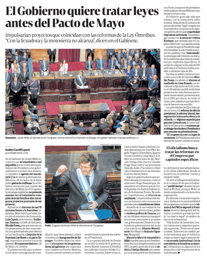 Impulsarían proyectos que coincidan con las reformas de la Ley Ómnibus. «Con la licuadora y la motosierra no alcanza», dicen en el Gabinete.En el Gabinete de Javier Milei reconocen que es improbable o casi imposible que la convocatoria preliminar del Presidente a los gobernadores se concrete esta semana.Lo impiden la agenda del mandatario y la de varios gobernadores.Mientras, de los lados de la mesa piden gestos de confianza. En el Gobierno reconocen que, a pesar del discurso de Milei en el Congreso, la estrategia legislativa no pretende avanzar con el tratamiento completo de la ley ómnibus sino con algunos proyectos puntuales de ese proyecto.Al final de su discurso de casi 75 minutos frente a la Asamblea Legislativa, Milei relató que había instruido al ministro de Economía, Luis Caputo, al de Interior, Guillermo Francos, y al jefe de Gabinete, Nicolás Posse, para que avancen en los preparativos de una convocatoria a los gobernadores para debatir en la Casa Rosada el impulso de la frustrada Ley Bases y un pacto fiscal, requisitos previos antes de plasmar 10 consensos básicos el 25 de Mayo, en Córdoba El primer escollo para acelerar el encuentro es la agenda del man- datario, que tiene previsto asistir el martes a la inauguración de Expoagro.También dilata los tiempos el encuentro de los gobernadores patagónicos que organizan una cumbre en Puerto Madryn, Chubut, adonde asistiría el ministro del Interior y adonde fue invitado el Presidente.La propuesta del jefe de Estado ya recibió la venia de 13 gobernadores: Martín Llaryora (Córdoba); los radicales Gustavo Valdés (Corrientes), Leandro Zdero (Chaco Carlos Sadir (Jujuy) y Alfredo Cornejo (Mendoza); los 3 del PRO, Rogelio Frigerio (Entre Ríos), Ignacio Torres (Chubut) y Jorge Macri (CABA); los provinciales de JxC Marcelo Orrego (San Juan) y Claudio Poggi (San Luis) y los peronistas Osvaldo Jaldo (Tucumán) y Raúl Jalil (Catamarca) y el ex massista Gustavo Sáenz (Salta).Algunos gobernadores que podrían abrazar el consenso, como el misionero Hugo Passalacqua, demandaron al Gobierno ante la Corte Suprema o la Justicia Federal como el chubutense Torres. No sería un impedimento, el vínculo es cambiante. Los peronistas más duros reclamaron esta semana por partidas para comedores escolares.Además de la necesidad de los mandatarios provinciales, primó la muñeca política de Francos que en las últimas semanas inauguró reuniones personales y grupales con gobernadores. Desde los colaborativos gobernadores del norte a los más duros Alberto Weretilneck (Río Negro) y Rolando Figueroa (Neuquén).Mauricio Macri le transmitió a Milei el pedido para que el Presidente reciba a los tres gobernadores del PRO, un gesto parecido al que le dedicó a Cristian Ritondo esta semana.La postal podría ser finalmente con Posse, aunque el ex presidente suele quejarse de que Milei muchas veces no le hace caso.El Gobierno ganó algo más que tiempo. Con la convocatoria sobre la mesa -después de 45 minutos de pirotecnia verbal- logró congelar los movimientos incipientes de algunos gobernadores para coparticipar impuestos nacionales. Esa estrategia cuenta con la venia de Cristina Kirchner, que reclama que el Congreso debe tener una agenda propia.A pesar de que el Presidente sugirió revitalizar la Ley ómnibus que – en sus palabras- fue «manoseada», la estrategia del Gobierno es discutir las reformas que más les interesan por capítulos específicos. El proyecto original tenía más de 600 artículos y el Gobierno había accedido a eliminar más de 200.Esa idea se volvió a tratar en la reunión que el jefe de Gabinete Nicolás Posse encabezó el viernes al mediodía en Casa Rosada con senadores y diputados de LLA. Incluso el oficialismo podría revitalizar proyectos de otras fuerzas que todavía tienen estado parlamentario.En el PRO por ahora no están al tanto, pero admiten que hay decenas de leyes en ese sentido.Las prioridades del Ejecutivo giran en torno a la reforma de cálculo previsional, la reforma laboral, desregulación hidrocarburífera y de minería, un régimen especial para grandes inversiones, la esencialidad de la Educación y consenso para delegar facultades al Presidente y para avanzar en privatizaciones.»El Congreso va a ser un lugar de consensos. El Presidente marcó los ejes hacia futuro», señaló el ministro del Interior este sábado durante su visita a Mendoza, donde se mostró con el anfitrión Cornejo y el jujeño Sadir.Un sector influyente del Gabinete se convenció de que el Gobierno «perdió tiempo» durante los primeros 82 días, aunque Milei se sienta empoderado a la hora de la negociación.En sintonía con las preocupaciones y dudas por la sustentabilidad del programa económico que la número 2 del FMI le expresó al Presidente, el sector dialoguista del Gobierno considera que hay que darle «un marco legal» al cambio de época en la Argentina.»Hay fondos de inversión, bancos inversores y empresas que están esperando. Todos ven la oportunidad.Todos ven un cambio, pero necesitamos que el Gobierno tenga un marco legal y para eso sirve un acuerdo institucional. Con la motosierra y la licuadora no alcanza», reflexionan en algunos de los despachos más importante de la Casa Rosada.