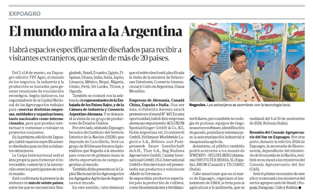 Cabe mencionar que en el marco de Expoagro, organizan el lanzamiento de EIMA, la feria para la agricultura y la jardinería, que se realizará del 6 al 10 de noviembre de 2024, Bolonia (Italia).