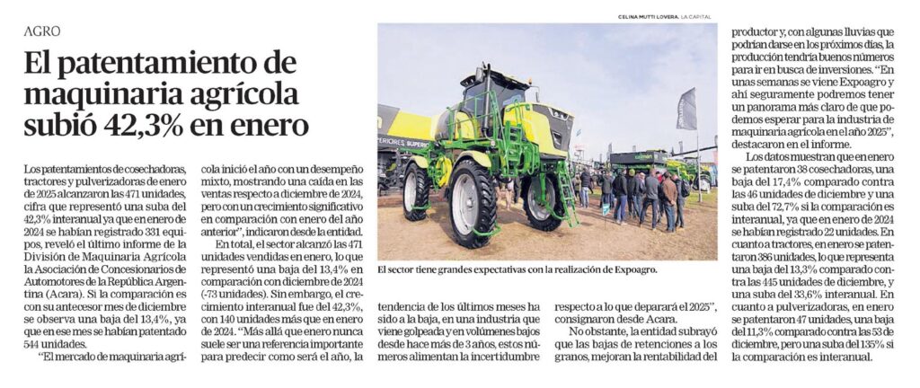 Los patentamientos de cosechadoras, tractores y pulverizadoras de enero de 2025 alcanzaron las 471 unidades, cifra que representó una suba del 42,3% interanual ya que en enero de 2024 se habían registrado 331 equipos, reveló el último informe de la División de Maquinaria Agrícola de la Asociación de Concesionarios de Automotores de la República Argentina (Acara). Si la comparación es con su antecesor mes de diciembre se observa una baja del 13,4%, ya que en ese mes se habían patentado 544 unidades.
