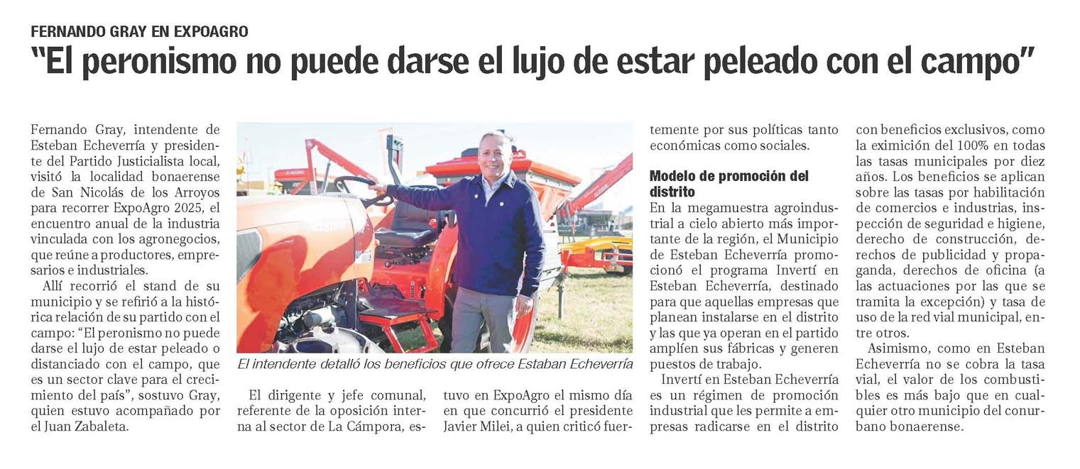 … intendente de Esteban Echeverría y presidente del Partido Justicialista local, visitó la localidad bonaerense de San Nicolás de los Arroyos para recorrer ExpoAgro 2025, el encuentro anual de la industria vinculada con los agronegocios, que reúne a productores, empresarios e industriales. Allí recorrió el stand de…