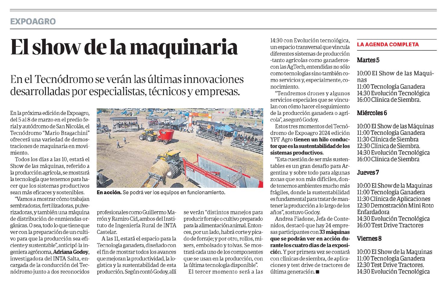 En el Tecnódromo se verán las últimas innovaciones desarrolladas por especialistas, técnicos y empresas.En acción. Se podrá ver los equipos en funcionamiento.En la próxima edición de Expoagro, del 5 al 8 de marzo en el predio ferial y autódromo de San Nicolás, el Tecnódromo «Mario Bragachini» ofrecerá una variedad de demostraciones de maquinaria en movimiento.Todos los días a las 10, estará el Show de las máquinas, referido a la producción agrícola, se mostrará la tecnología que tenemos para hacer que los sistemas productivos sean más eficaces y sostenibles.»Vamos a mostrar cómo trabajan sembradoras, fertilizadoras, pulverizadoras, y también una máquina de distribución de enmiendas orgánicas.O sea, todo lo que tiene que ver con la preparación de un cultivo para que la producción sea eficiente y sustentable», anticipó la ingeniera agrónoma, Adriana Godoy, investigadora del INTA Salta, encargada de la conducción del Tecnódromo junto a dos reconocidos profesionales como Guillermo Marrón y Ramiro Cid, ambos del Instituto de Ingeniería Rural de INTA Castelar.A las 11, estará el espacio para la Tecnología ganadera, diseñado con el fin de mostrar todos los avances que mejoran la productividad, la logística y la sustentabilidad de esta producción. Según contó Godoy, allí se verán «distintos manejos para producir forraje o cultivo preparado para la alimentación animal. Entonces, por un lado, habrá corte y picado de forraje; y por otro, rollos, mixers, embolsado y tolvas. Se mostrará cada uno de los componentes que se usan en la producción, con la última tecnología disponible».El tercer momento será a las 14:30 con Evolución tecnológica, un espacio transversal que vincula diferentes sistemas de producción -tanto agrícolas como ganaderoscon las AgTech, entendidas no sólo como tecnologías sino también como servicios y, especialmente, conocimiento.»Tendremos drones y algunos servicios especiales que se vinculan con cómo hacer el seguimiento de la producción ganadera o agrícola», aseguró Godoy.Estos tres momentos del Tecnódromo de Expoagro 2024 edición YPF Agro tienen un hilo conductor que es la sustentabilidad de los sistemas productivos.»Esta cuestión de ser más sustentables es un gran desafío para Argentina y sobre todo para algunas zonas que son más difíciles, donde tenemos ambientes mucho más frágiles, donde la sustentabilidad es fundamental para tratar de mantener la producción a lo largo de los años», sostuvo Godoy.Andrea Fiadone, Jefa de Contenidos, destacó que hay 24 empresas participantes con 33 máquinas que se podrán ver en acción durante los cuatro días de la exposición.Y por primera vez se contará con clínicas de siembra, de aplicaciones y test drive de tractores de última generación.LA AGENDA COMPLETAMartes 510:00 El Show de las Maquinas11:00 Tecnología Ganadera14:30 Evolución Tecnológica16:00 Clínica de Siembra.Miércoles 610:00 El Show de las Máquinas11:00 Tecnología Ganadera11:30 Clínica de Siembra12:30 Clínica de Siembra.14:30 Evolución Tecnológica16:00 Clínica de SiembraJueves 710:00 El Show de la Maquinas11:00 Tecnología Ganadera11:30 Clínica de Aplicaciones12:30 Demostración Mini RotoEnfardadora14:30 Evolución Tecnológica16:00 Test Drive TractoresViernes 810:00 El Show de la Maquinas11:00 Tecnología Ganadera12:30 Test Drive Tractores.14:30 Evolución Tecnológica