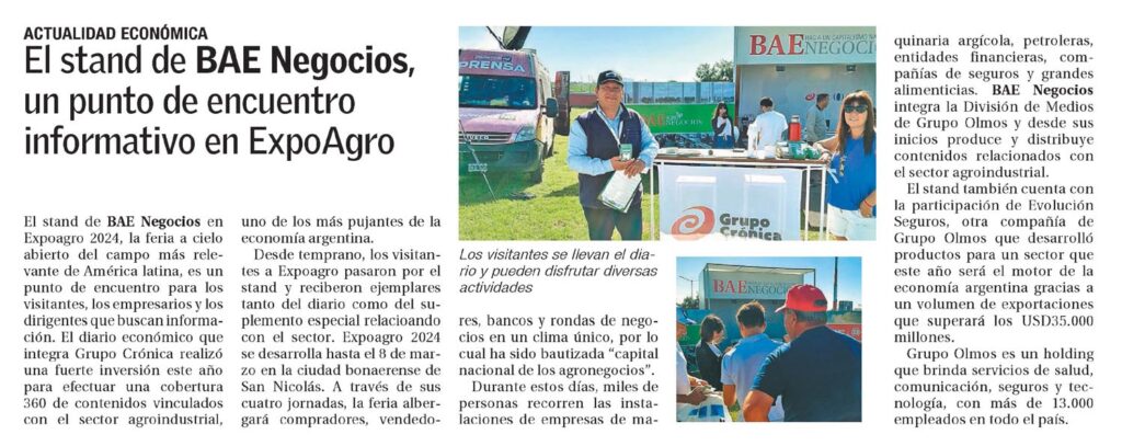 El stand de BAE Negocios en Expoagro 2024, la feria a cielo abierto del campo más relevante de América latina, es un punto de encuentro para los visitantes, los empresarios y los dirigentes que buscan información.El diario económico que integra Grupo Crónica realizó una fuerte inversión este año para efectuar una cobertura 360 de contenidos vinculados con el sector agroindustrial, uno de los más pujantes de la economía argentina.Desde temprano, los visitantes a Expoagro pasaron por el stand y reciberon ejemplares tanto del diario como del suplemento especial relacioando con el sector. Expoagro 2024 se desarrolla hasta el 8 de marzo en la ciudad bonaerense de San Nicolás. A través de sus cuatro jornadas, la feria albergará compradores, vendedores, bancos y rondas de negocios en un clima único, por lo cual ha sido bautizada «capital nacional de los agronegocios».Durante estos días, miles de personas recorren las instalaciones de empresas de maquinaria argícola, petroleras, entidades financieras, compañías de seguros y grandes alimenticias. BAE Negocios integra la División de Medios de Grupo Olmos y desde sus inicios produce y distribuye contenidos relacionados con el sector agroindustrial.El stand también cuenta con la participación de Evolución Seguros, otra compañía de Grupo Olmos que desarrolló productos para un sector que este año será el motor de la economía argentina gracias a un volumen de exportaciones que superará los USD35.000 millones.Grupo Olmos es un holding que brinda servicios de salud, comunicación, seguros y tecnología, con más de 13.000 empleados en todo el país.