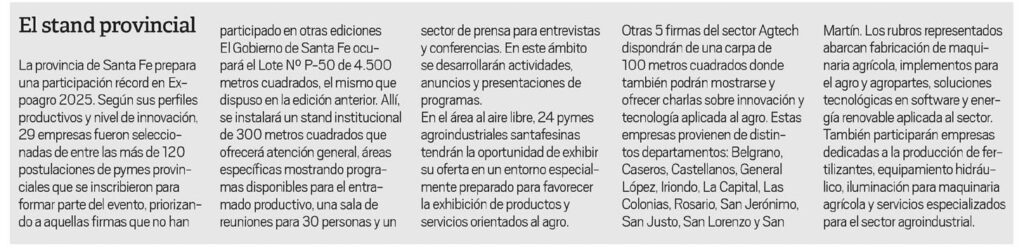 La provincia de Santa Fe prepara una participación récord en Expoagro 2025. Según sus perfiles productivos y nivel de innovación, 29 empresas fueron seleccionadas de entre las más de 120 postulaciones de pymes provinciales que se inscribieron para formar parte del evento, priorizando a aquellas firmas que no han participado en otras ediciones.