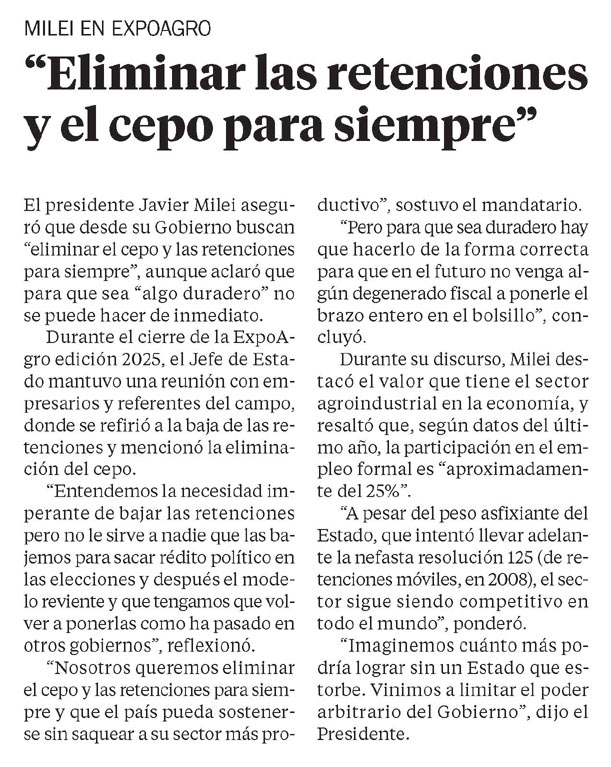 …Milei en Expoagro “Eliminar las retenciones y el cepo para siempre” El presidente Javier Milei aseguró que desde su Gobierno buscan “eliminar el cepo…