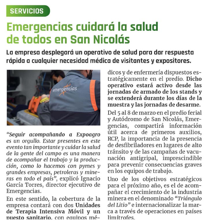 La empresa desplegará un operativo de salud para dar respuesta rápida a cualquier necesidad médica de visitantes y expositores.«Seguir acompañando a Expoagro es un orgullo. Estar presentes en este evento tan importante y cuidar la salud de la gente del campo es una manera de acompañar el trabajo y la producción, como lo hacemos con pymes y grandes empresas, petroleras y mineras en todo el país», explicó Ignacio García Torres, director ejecutivo de Emergencias.En este sentido, la cobertura de la empresa contará con dos Unidades de Terapia Intensiva Móvil y un puesto sanitario, con equipos médicos y de enfermería dispuestos estratégicamente en el predio. Dicho operativo estará activo desde las jornadas de armado de los stands y se extenderá durante los días de la muestra y las jornadas de desarme.Del 5 al 8 de marzo en el predio ferial y Autódromo de San Nicolás, Emergencias, compartirá información útil acerca de primeros auxilios, RCP, la importancia de la presencia de desfibriladores en lugares de alto tránsito y de las campañas de vacunación antigripal, imprescindible para prevenir consecuencias graves en los equipos de trabajo.Uno de los objetivos estratégicos para el próximo año, es el de acompañar el crecimiento de la industria minera en el denominado «Triángulo del Litio» e internacionalizar la marca a través de operaciones en países limítrofes.