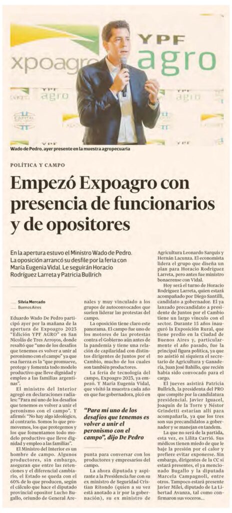 Eduardo Wado De Pedro participó ayer por la mañana de la apertura de Expoagro 2023 «Edición YPF AGRO» en San Nicolás de Tres Arroyos, donde resaltó que «uno de los desafíos que tenemos es volver a unir al peronismo con el campo» ya que esa fuerza es la «que promueve, protege y fomenta todo modelo productivo que lleve dignidad y empleo a las familias argentinas».