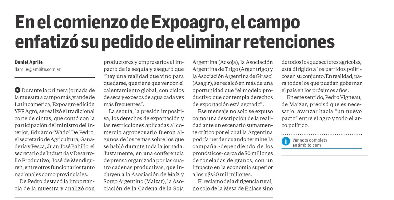 Durante la primera jornada de la muestra a campo más grande de Latinoamérica, Expoagro edición YPF Agro, se realizó el tradicional corte de cintas, que contó con la participación del ministro del Interior, Eduardo ?Wado? De Pedro, el secretario de Agricultura, Ganadería y Pesca, Juan José Bahillo, el secretario de Industria y Desarrollo Productivo, José de Mendiguren, entre otros funcionarios tanto nacionales como provinciales. De Pedro destacó la importancia de la muestra y analizó con productores y empresarios el impacto de la sequía y aseguró que «hay una realidad que vino para quedarse, que tiene que ver con el calentamiento global, con ciclos de seca y excesos de agua cada vez más frecuentes». La sequía, la presión impositiva, los derechos de exportación y las restricciones aplicadas al comercio agropecuario fueron algunos de los temas sobre los que se habló durante toda la jornada. Justamente, en una conferencia de prensa organizada por las cuatro cadenas productivas, que incluyen a la Asociación de Maíz y Sorgo Argentino (Maizar), la Asociación de la Cadena de la Soja Argentina (Acsoja), la Asociación Argentina de Trigo (Argentrigo) y la Asociación Argentina de Girasol (Asagir), se recalcó en más de una oportunidad que «el modelo productivo que contempla derechos de exportación está agotado». Ese mensaje no solo se expuso como una descripción de la realidad ante un escenario sumamente crítico por el cual la Argentina podría perder cuando termine la campaña -dependiendo de los pronósticos- cerca de 50 millones de toneladas de granos, con un impacto en la economía superior a los u$s20 mil millones. El reclamo de la dirigencia rural, no solo de la Mesa de Enlace sino de todos los que sectores agrícolas, está dirigido a los partidos políticos en su conjunto. En realidad, para todos los que puedan gobernar el país en los próximos años. En este sentido, Pedro Vigneau, de Maizar, precisó que es necesario avanzar hacia «un nuevo pacto» entre el agro y todo el arco político.