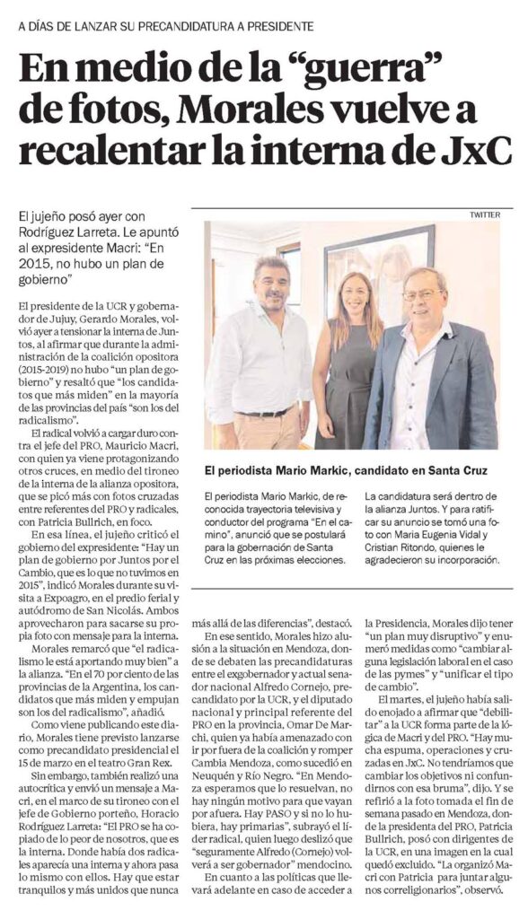 En ese sentido, Morales hizo alusión a la situación en Mendoza, donde se debaten las precandidaturas entre el exgobernador y actual senador nacional Alfredo Cornejo, precandidato por la UCR, y el diputado nacional y principal referente del PRO en la provincia, Omar De Marchi, quien ya había amenazado con ir por fuera de la coalición y romper Cambia Mendoza, como sucedió en Neuquén y Río Negro. «En Mendoza esperamos que lo resuelvan, no hay ningún motivo para que vayan por afuera. Hay PASO y si no lo hubiera, hay primarias», subrayó el líder radical, quien luego deslizó que «seguramente Alfredo (Cornejo) volverá a ser gobernador» mendocino.