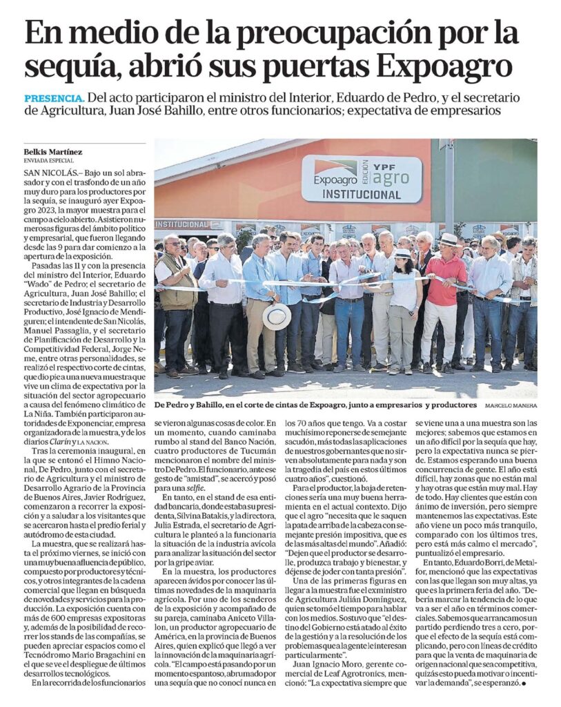 Pasadas las 11 y con la presencia del ministro del Interior, Eduardo «Wado» de Pedro; el secretario de Agricultura, Juan José Bahillo; el secretario de Industria y Desarrollo Productivo, José Ignacio de Mendiguren; el intendente de San Nicolás, Manuel Passaglia, y el secretario de Planificación de Desarrollo y la Competitividad Federal, Jorge Neme, entre otras personalidades, se realizó el respectivo corte de cintas, que dio pie a una nueva muestra que vive un clima de expectativa por la situación del sector agropecuario a causa del fenómeno climático de La Niña. También participaron autoridades de Exponenciar, empresa organizadora de la muestra, y de los diarios Clarín y la nacion.
