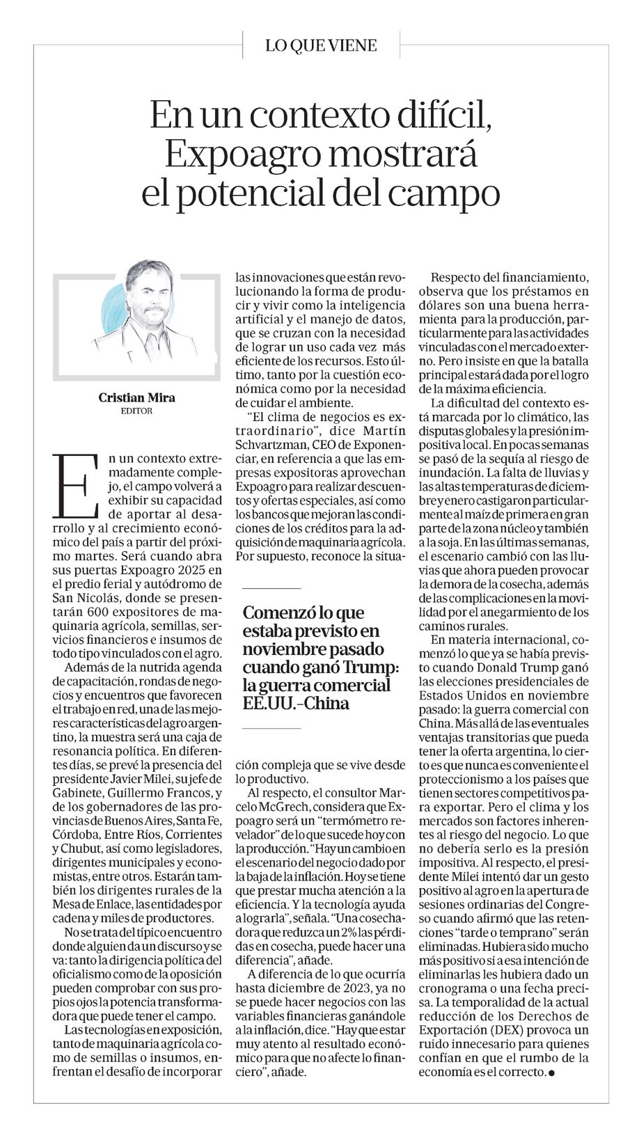 Ai respecto, el consultor Marcelo McGrech, considera que Ex- poagro será un «termómetro revelador» de lo que sucede hoy con la producción. «Hay un cambio en el escenario del negocio dado por la baja de la inflación. Hoy se tiene que prestar mucha atención a la eficiencia. Y la tecnología ayuda a lograrla», señala. «Una cosechadora que reduzca un 2% las pérdidas en cosecha, puede hacer una diferencia», añade.