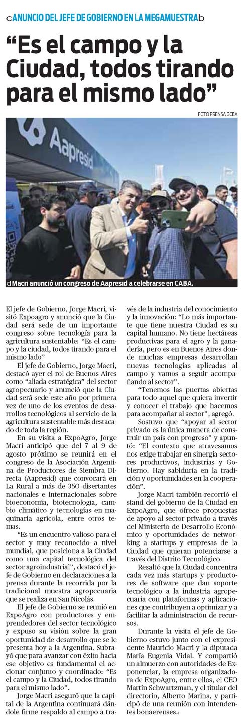 El jefe de Gobierno, Jorge Macri, visitó Expoagro y anunció que la Ciudad será sede de un importante congreso sobre tecnología para la agricultura sustentable: «Es el campo y la ciudad, todos tirando para el mismo lado» El jefe de Gobierno, Jorge Macri, destacó ayer el rol de Buenos Aires como «aliada estratégica» del sector agropecuario y anunció que la Ciudad será sede este año por primera vez de uno de los eventos de desarrollos tecnológicos al servicio de la agricultura sustentable más destacado de toda la región.En su visita a ExpoAgro, Jorge Macri anticipó que del 7 al 9 de agosto próximo se reunirá en el congreso de la Asociación Argentina de Productores de Siembra Directa (Aapresid) que convocará en La Rural a más de 350 disertantes nacionales e internacionales sobre bioeconomía, biotecnología, cambio climático y tecnologías en maquinaria agrícola, entre otros temas.»Es un encuentro valioso para el sector y muy reconocido a nivel mundial, que posiciona a la Ciudad como una capital tecnológica del sector agroindustrial», destacó el jefe de Gobierno en declaraciones a la prensa durante la recorrida por la tradicional muestra agropecuaria que se realiza en San Nicolás.El jefe de Gobierno se reunió en ExpoAgro con productores y emprendedores del sector tecnológico y expuso su visión sobre la gran oportunidad de desarrollo que se le presenta hoy a la Argentina. Subrayó que para avanzar con éxito hacia ese objetivo es fundamental el accionar conjunto y coordinado: «Es el campo y la Ciudad, todos tirando para el mismo lado».Jorge Macri aseguró que la capital de la Argentina continuará dándole firme respaldo al campo a través de la industria del conocimiento y la innovación: «Lo más importante que tiene nuestra Ciudad es su capital humano. No tiene hectáreas productivas para el agro y la ganadería, pero es en Buenos Aires donde muchas empresas desarrollan nuevas tecnologías aplicadas al campo y vamos a seguir acompañando al sector».»Tenemos las puertas abiertas para todo aquel que quiera invertir y conocer el trabajo que hacemos para acompañar al sector», agregó.Sostuvo que «apoyar al sector privado es la única manera de construir un país con progreso» y apuntó: «El contexto que atravesamos nos exige trabajar en sinergia sectores productivos, industrias y Gobierno.Hay sabiduría en la tradición y oportunidades en la cooperación».Jorge Macri también recorrió el stand del gobierno de la Ciudad en ExpoAgro, que ofrece propuestas de apoyo al sector privado a través del Ministerio de Desarrollo Económico y oportunidades de networking a startups y empresas de la Ciudad que quieran potenciarse a través del Distrito Tecnológico.Resaltó que la Ciudad concentra cada vez más startups y productores de software que dan soporte tecnológico a la industria agropecuaria con plataformas y aplicaciones que contribuyen a optimizar y a facilitar la administración de recursos.Durante la visita el jefe de Gobierno estuvo junto con el expresidente Mauricio Macri y la diputada María Eugenia Vidal. Y compartió un almuerzo con autoridades de Exponenciar, la empresa organizadora de ExpoAgro, entre ellos, el CEO Martín Schwartzman, y el titular del directorio, Alberto Marina, y participó de una reunión con intendentes bonaerenses.