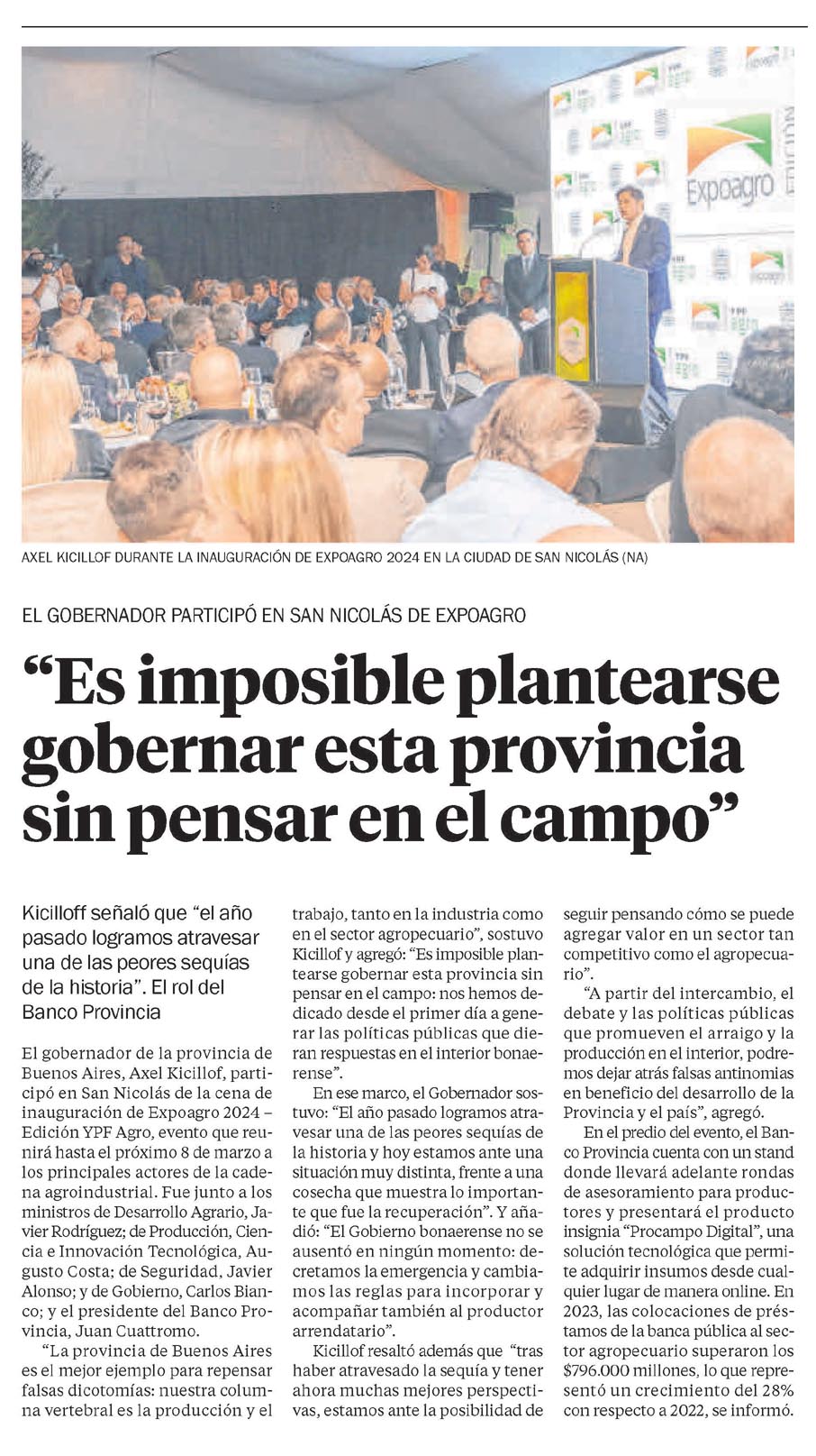 Kicilloff señaló que «el año pasado logramos atravesar una de las peores sequías de la historia». El rol del Banco ProvinciaEl gobernador de la provincia de Buenos Aires, Axel Kicillof, participó en San Nicolás de la cena de inauguración de Expoagro 2024 ? Edición YPF Agro, evento que reunirá hasta el próximo 8 de marzo a los principales actores de la cadena agroindustrial. Fue junto a los ministros de Desarrollo Agrario, Javier Rodríguez; de Producción, Ciencia e Innovación Tecnológica, Augusto Costa; de Seguridad, Javier Alonso; y de Gobierno, Carlos Bianco; y el presidente del Banco Provincia, Juan Cuattromo.»La provincia de Buenos Aires es el mejor ejemplo para repensar falsas dicotomías: nuestra columna vertebral es la producción y el trabajo, tanto en la industria como en el sector agropecuario», sostuvo Kicillof y agregó: «Es imposible plantearse gobernar esta provincia sin pensar en el campo: nos hemos dedicado desde el primer día a generar las políticas públicas que dieran respuestas en el interior bonaerense».En ese marco, el Gobernador sostuvo: «El año pasado logramos atravesar una de las peores sequías de la historia y hoy estamos ante una situación muy distinta, frente a una cosecha que muestra lo importante que fue la recuperación». Y añadió: «El Gobierno bonaerense no se ausentó en ningún momento: decretamos la emergencia y cambiamos las reglas para incorporar y acompañar también al productor arrendatario».Kicillof resaltó además que «tras haber atravesado la sequía y tener ahora muchas mejores perspectivas, estamos ante la posibilidad de seguir pensando cómo se puede agregar valor en un sector tan competitivo como el agropecuario».»A partir del intercambio, el debate y las políticas públicas que promueven el arraigo y la producción en el interior, podremos dejar atrás falsas antinomias en beneficio del desarrollo de la Provincia y el país», agregó.En el predio del evento, el Banco Provincia cuenta con un stand donde llevará adelante rondas de asesoramiento para productores y presentará el producto insignia «Procampo Digital», una solución tecnológica que permite adquirir insumos desde cualquier lugar de manera online. En 2023, las colocaciones de préstamos de la banca pública al sector agropecuario superaron los $796.000 millones, lo que representó un crecimiento del 28% con respecto a 2022, se informó.AXEL KICILLOF DURANTE LA INAUGURACIÓN DE EXPOAGRO 2024 EN LA CIUDAD DE SAN NICOLÁS (NA)