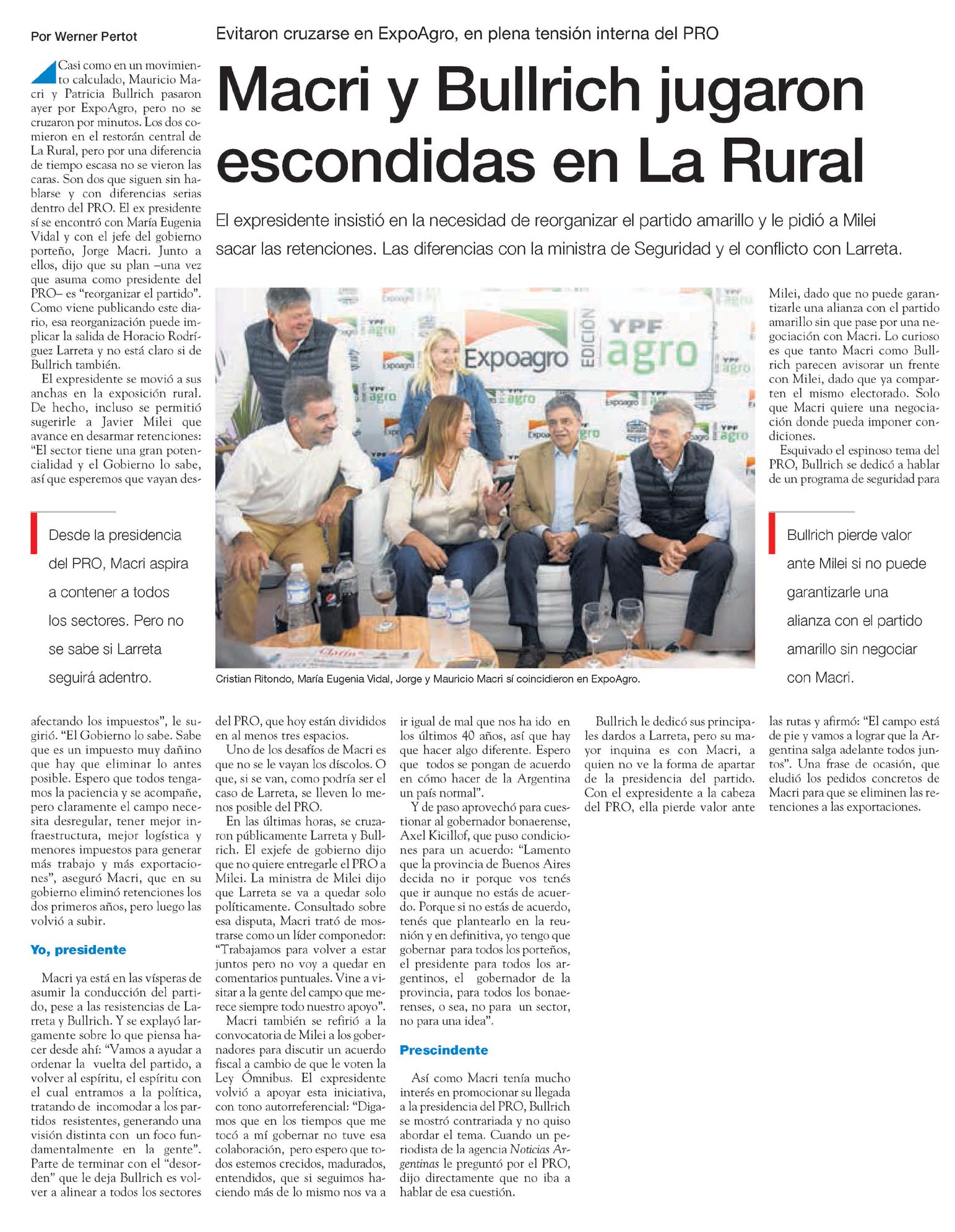 El expresidente insistió en la necesidad de reorganizar el partido amarillo y le pidió a Milei sacar las retenciones. Las diferencias con la ministra de Seguridad y el conflicto con Larreta.Cristian Ritondo, María Eugenia Vidal, Jorge y Mauricio Macri sí coincidieron en ExpoAgro.Casi como en un movimiento calculado, Mauricio Macri y Patricia Bullrich pasaron ayer por ExpoAgro, pero no se cruzaron por minutos. Los dos comieron en el restorán central de La Rural, pero por una diferencia de tiempo escasa no se vieron las caras. Son dos que siguen sin hablarse y con diferencias serias dentro del PRO. El ex presidente sí se encontró con María Eugenia Vidal y con el jefe del gobierno porteño, Jorge Macri. Junto a ellos, dijo que su plan ?una vez que asuma como presidente del PRO? es «reorganizar el partido».Como viene publicando este diario, esa reorganización puede implicar la salida de Horacio Rodríguez Larreta y no está claro si de Bullrich también.El expresidente se movió a sus anchas en la exposición rural.De hecho, incluso se permitió sugerirle a Javier Milei que avance en desarmar retenciones: «El sector tiene una gran potencialidad y el Gobierno lo sabe, así que esperemos que vayan desafectando los impuestos», le sugirió.»El Gobierno lo sabe. Sabe que es un impuesto muy dañino que hay que eliminar lo antes posible. Espero que todos tengamos la paciencia y se acompañe, pero claramente el campo necesita desregular, tener mejor infraestructura, mejor logística y menores impuestos para generar más trabajo y más exportaciones», aseguró Macri, que en su gobierno eliminó retenciones los dos primeros años, pero luego las volvió a subir.Yo, presidenteMacri ya está en las vísperas de asumir la conducción del partido, pese a las resistencias de Larreta y Bullrich. Y se explayó largamente sobre lo que piensa hacer desde ahí: «Vamos a ayudar a ordenar la vuelta del partido, a volver al espíritu, el espíritu con el cual entramos a la política, tratando de incomodar a los partidos resistentes, generando una visión distinta con un foco fundamentalmente en la gente».Parte de terminar con el «desorden» que le deja Bullrich es volver a alinear a todos los sectores del PRO, que hoy están divididos en al menos tres espacios.Uno de los desafíos de Macri es que no se le vayan los díscolos. O que, si se van, como podría ser el caso de Larreta, se lleven lo menos posible del PRO.En las últimas horas, se cruzaron públicamente Larreta y Bullrich.El exjefe de gobierno dijo que no quiere entregarle el PRO a Milei. La ministra de Milei dijo que Larreta se va a quedar solo políticamente. Consultado sobre esa disputa, Macri trató de mostrarse como un líder componedor: «Trabajamos para volver a estar juntos pero no voy a quedar en comentarios puntuales. Vine a visitar a la gente del campo que merece siempre todo nuestro apoyo».Macri también se refirió a la convocatoria de Milei a los gobernadores para discutir un acuerdo fiscal a cambio de que le voten la Ley Ómnibus. El expresidente volvió a apoyar esta iniciativa, con tono autorreferencial: «Digamos que en los tiempos que me tocó a mí gobernar no tuve esa colaboración, pero espero que todos estemos crecidos, madurados, entendidos, que si seguimos haciendo más de lo mismo nos va a ir igual de mal que nos ha ido en los últimos 40 años, así que hay que hacer algo diferente. Espero que todos se pongan de acuerdo en cómo hacer de la Argentina un país normal».Y de paso aprovechó para cuestionar al gobernador bonaerense, Axel Kicillof, que puso condiciones para un acuerdo: «Lamento que la provincia de Buenos Aires decida no ir porque vos tenés que ir aunque no estás de acuerdo.Porque si no estás de acuerdo, tenés que plantearlo en la reunión y en definitiva, yo tengo que gobernar para todos los porteños, el presidente para todos los argentinos, el gobernador de la provincia, para todos los bonaerenses, o sea, no para un sector, no para una idea».PrescindenteAsí como Macri tenía mucho interés en promocionar su llegada a la presidencia del PRO, Bullrich se mostró contrariada y no quiso abordar el tema. Cuando un periodista de la agencia Noticias Argentinas le preguntó por el PRO, dijo directamente que no iba a hablar de esa cuestión.Bullrich le dedicó sus principales dardos a Larreta, pero su mayor inquina es con Macri, a quien no ve la forma de apartar de la presidencia del partido.Con el expresidente a la cabeza del PRO, ella pierde valor ante Milei, dado que no puede garantizarle una alianza con el partido amarillo sin que pase por una negociación con Macri. Lo curioso es que tanto Macri como Bullrich parecen avisorar un frente con Milei, dado que ya comparten el mismo electorado. Solo que Macri quiere una negociación donde pueda imponer condiciones.Esquivado el espinoso tema del PRO, Bullrich se dedicó a hablar de un programa de seguridad para las rutas y afirmó: «El campo está de pie y vamos a lograr que la Argentina salga adelante todos juntos».Una frase de ocasión, que eludió los pedidos concretos de Macri para que se eliminen las retenciones a las exportaciones.Desde la presidencia del PRO, Macri aspira a contener a todos los sectores. Pero no se sabe si Larreta seguirá adentro.Bullrich pierde valor ante Milei si no puede garantizarle una alianza con el partido amarillo sin negociar con Macri.