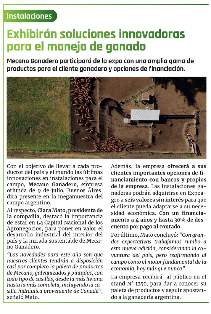 Mecano Ganadero participará de la expo con una amplia gama de productos para el cliente ganadero y opciones de financiación.Con el objetivo de llevar a cada productor del país y el mundo las últimas innovaciones en instalaciones para el campo, Mecano Ganadero, empresa oriunda de 9 de Julio, Buenos Aires, dirá presente en la megamuestra del campo argentino.Al respecto, Clara Mato, presidenta de la compañía, destacó la importancia de estar en La Capital Nacional de los Agronegocios, para poner en valor el desarrollo industrial del interior del país y la mirada sustentable de Mecano Ganadero.»Las novedades para este año son que nuestros clientes tendrán a disposición casi por completo la paleta de productos de Mecano, galvanizados y pintados, con todo tipo de casillas, desde la más liviana hasta la más completa, incluyendo la casilla hidráulica proveniente de Canadá», señaló Mato.Además, la empresa ofrecerá a sus clientes importantes opciones de fí- nanciamiento con bancos y propios de la empresa. Las instalaciones ganaderas podrán adquirirse en Expoagro a seis valores sin interés para que el cliente pueda adaptarse a su necesidad económica. Con un fínancia- miento a 4 años y hasta 30% de descuento por pago al contado.Por último, Mato concluyó: «Con grandes expectativas trabajamos rumbo a esta nueva edición, considerando la coyuntura del país, pero reafirmando al campo como el motor fundamental de la economía, hoy más que nunca».La empresa recibirá al público en el stand N° 1250, para dar a conocer su paleta de productos y seguir apostando a la ganadería argentina.