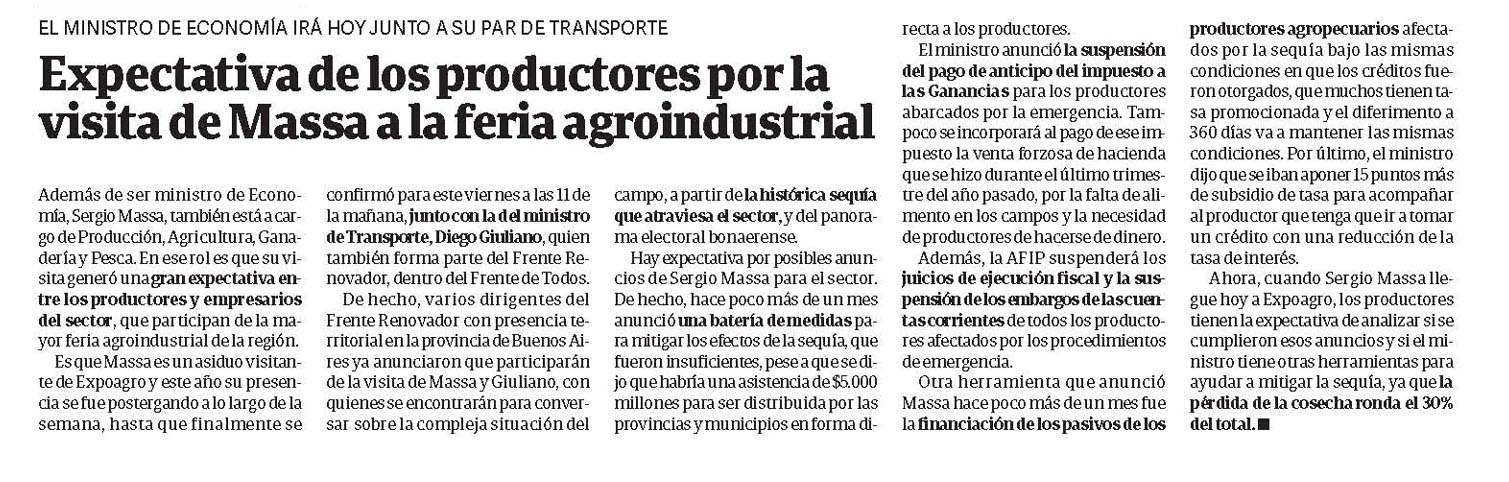 Ahora, cuando Sergio Massa llegue hoy a Expoagro, los productores tienen la expectativa de analizar si se cumplieron esos anuncios y si el ministro tiene otras herramientas para ayudar a mitigar la sequía, ya que la pérdida de la cosecha ronda el 30% del total.