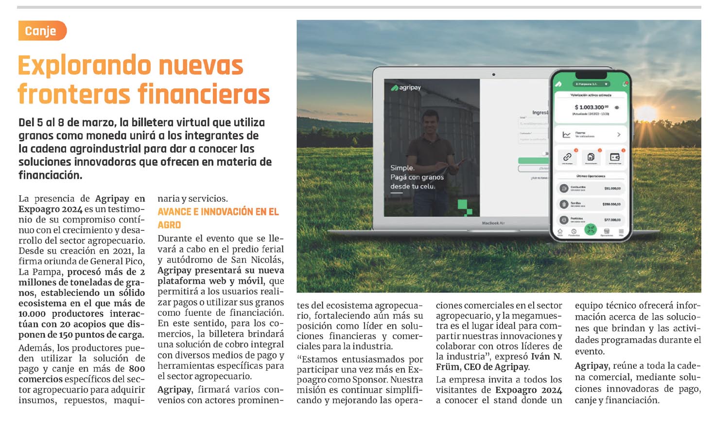 Durante el evento que se llevará a cabo en el predio ferial y autódromo de San Nicolás, Agripay presentará su nueva plataforma web y móvil, que permitirá a los usuarios realizar pagos o utilizar sus granos como fuente de financiación. En este sentido, para los comercios, la billetera brindará una solución de cobro integral con diversos medios de pago y herramientas específicas para el sector agropecuario. Agripay, firmará varios convenios con actores prominen- ^agripay tes del ecosistema agropecuario, fortaleciendo aún más su posición como líder en soluciones financieras y comerciales para la industria. «Estamos entusiasmados por participar una vez más en Expoagro como Sponsor. Nuestra misión es continuar simplificando y mejorando las operaciones comerciales en el sector agropecuario, y la megamuestra es el lugar ideal para compartir nuestras innovaciones y colaborar con otros líderes de la industria», expresó Iván N. Früm, CEO de Agripay.