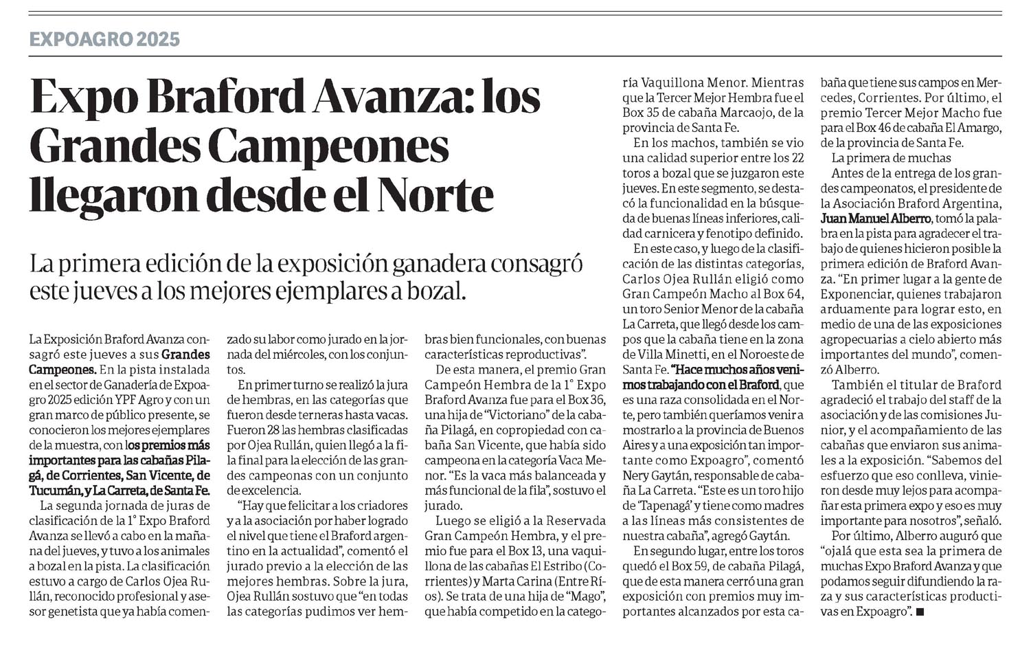 …La Exposición Braford Avanza consagró este jueves a sus Grandes Campeones. En la pista instalada en el sector de Ganadería de Expoag ro 2025 edición YPF Agro y con un gran marco de público presente, se conocieron los mejores ejemplares de la muestra, con los premios más importantes para…