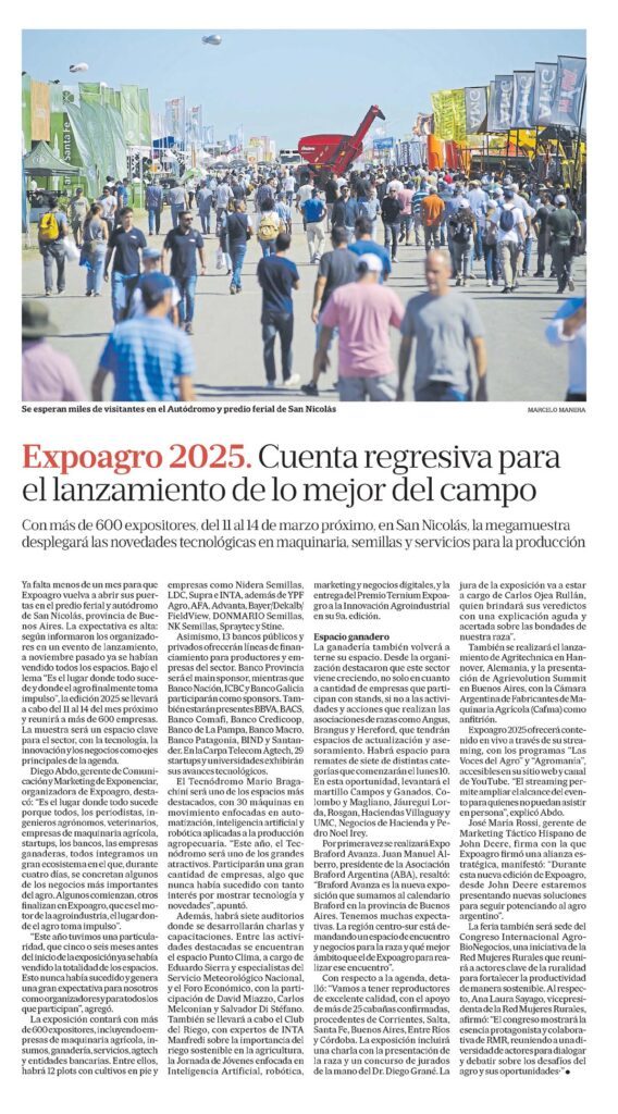 Ya falta menos de un mes para que Expoagro vuelva a abrir sus puertas en el predio ferial y autódromo de San Nicolás, provincia de Buenos Aires. La expectativa es alta: según informaron los organizadores en un evento de lanzamiento, a noviembre pasado ya se habían vendido todos los espacios. Bajo el lema «Es el lugar donde todo sucede y donde el agro finalmente toma impulso», la edición 2025 se llevará a cabo del 11 al 14 del mes próximo y reunirá a más de 600 empresas. La muestra será un espacio clave para el sector, con la tecnología, la innovación y los negocios como ejes principales de la agenda.