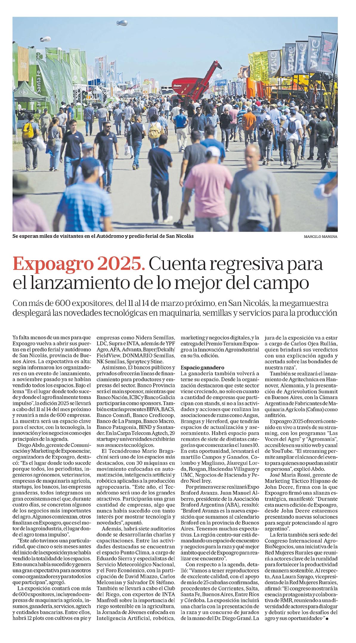 Diego Abdo, gerente de Comunicación y Marketing de Exponenciar, organizadora de Expoagro, destacó: «Es el lugar donde todo sucede porque todos, los periodistas, ingenieros agrónomos, veterinarios, empresas de maquinaria agrícola, startups, los bancos, las empresas ganaderas, todos integramos un gran ecosistema en el que, durante cuatro días, se concretan algunos de los negocios más importantes del agro. Algunos comienzan, otros finalizan en Expoagro, que es el motor de la agroindustria, el lugar donde el agro toma impulso».