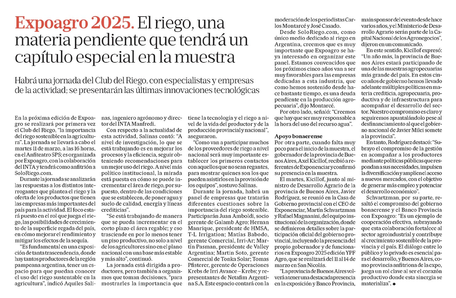 Desde SoloRiego.com, como único medio dedicado al riego en Argentina, creemos que es muy importante que Expoagro se haya interesado en organizar este panel. Estamos convencidos que los próximos cinco años van a ser muy favorables para las empresas dedicadas a esta industria, que como hemos sostenido desde hace bastante tiempo, es una deuda pendiente en la producción agropecuaria», dijo Montarcé.