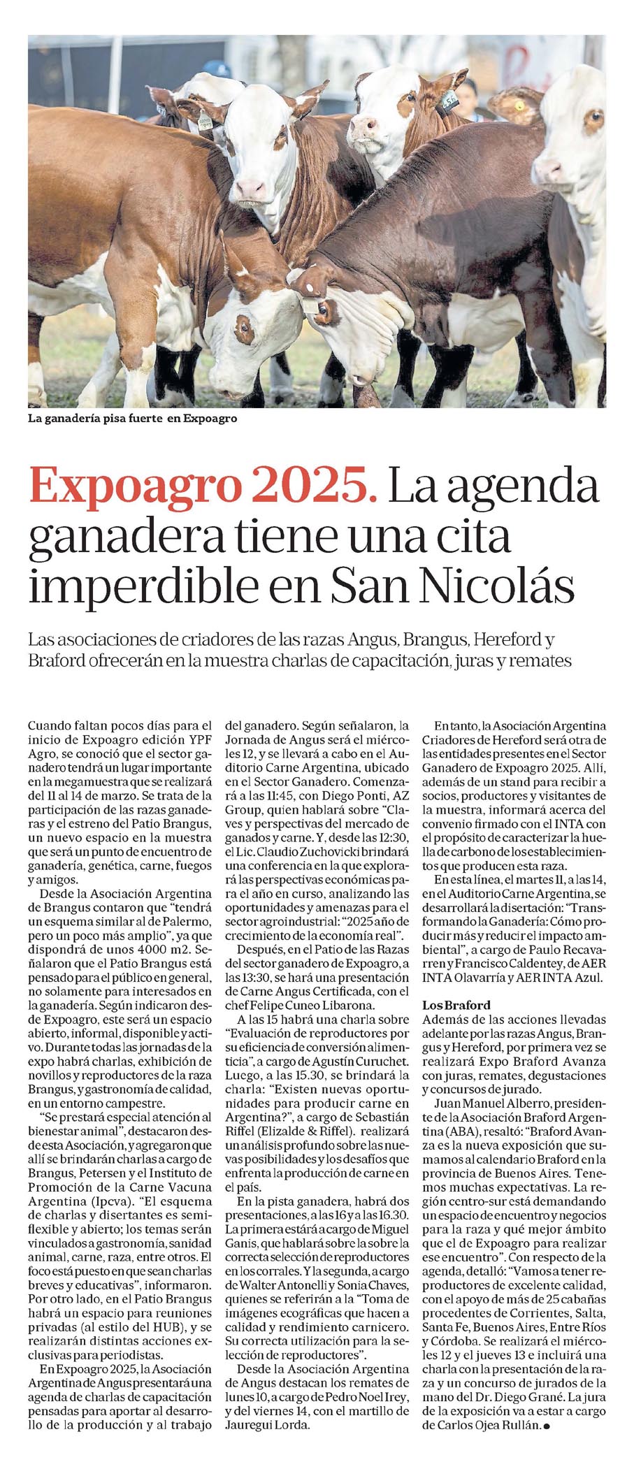 En Expoagro 2025, la Asociación Argentina de Angus presentará una agenda de charlas de capacitación pensadas para aportar al desarrollo de la producción y al trabajo del ganadero. Según señalaron, la Jornada de Angus será el miércoles 12, y se llevará a cabo en el Auditorio Carne Argentina, ubicado en el Sector Ganadero. Comenzará a las 11:45, con Diego Ponti, AZ Group, quien hablará sobre «Claves y perspectivas del mercado de ganados y carne. Y, desde las 12:30, el Lic. Claudio Zuchovicki brindará una conferencia en la que explorará las perspectivas económicas para el año en curso, analizando las oportunidades y amenazas para el sector agroindustrial: «2025 año de crecimiento de la economía real».