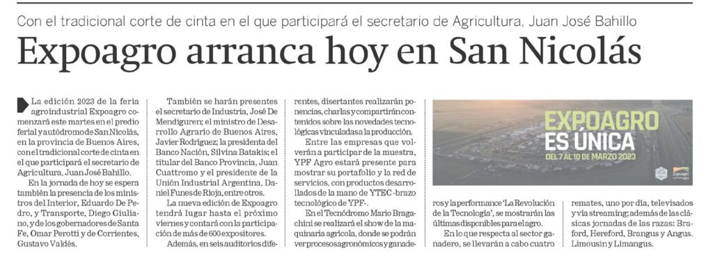 La edición 2023 de la feria agroindustrial Expoagro comenzará este martes en el predio ferial y autódromo de San Nicolás, en la provincia de Buenos Aires, con el tradicional corte de cinta en el que participará el secretario de Agricultura, Juan José Bahillo.