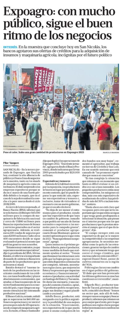 En tanto, el Banco Santander dijo que duplicó las operaciones de Expoagro 2022. «Excelente jornada», agregaron desde el Banco Provincia, donde indicaron que llevan 2900 presolicitudes por $120.000 millones.