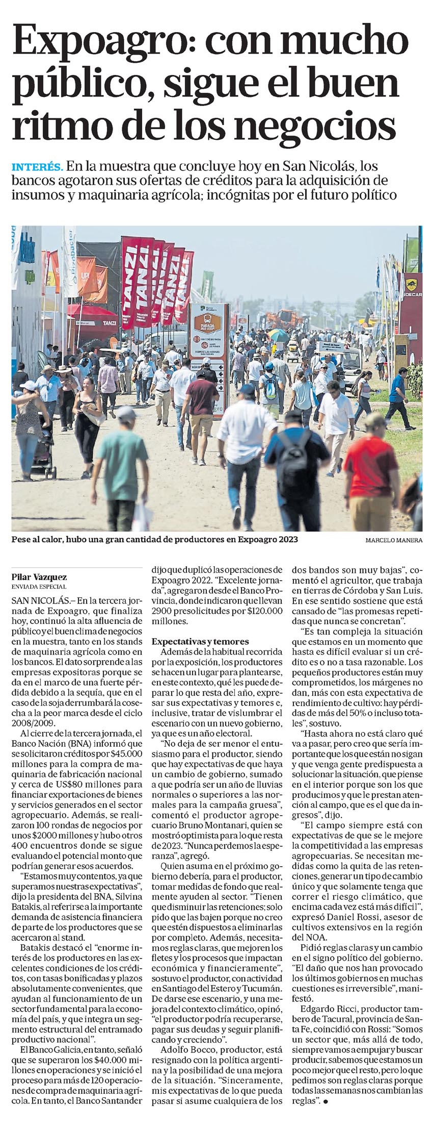 SAN NICOLÁS.? En la tercera jornada de Expoagro, que finaliza hoy, continuó la alta afluencia de público y el buen clima de negocios en la muestra, tanto en los stands de maquinaria agrícola como en los bancos. El dato sorprende a las empresas expositoras porque se da en el marco de una fuerte pérdida debido a la sequía, que en el caso de la soja derrumbará la cosecha a la peor marca desde el ciclo 2008/2009.