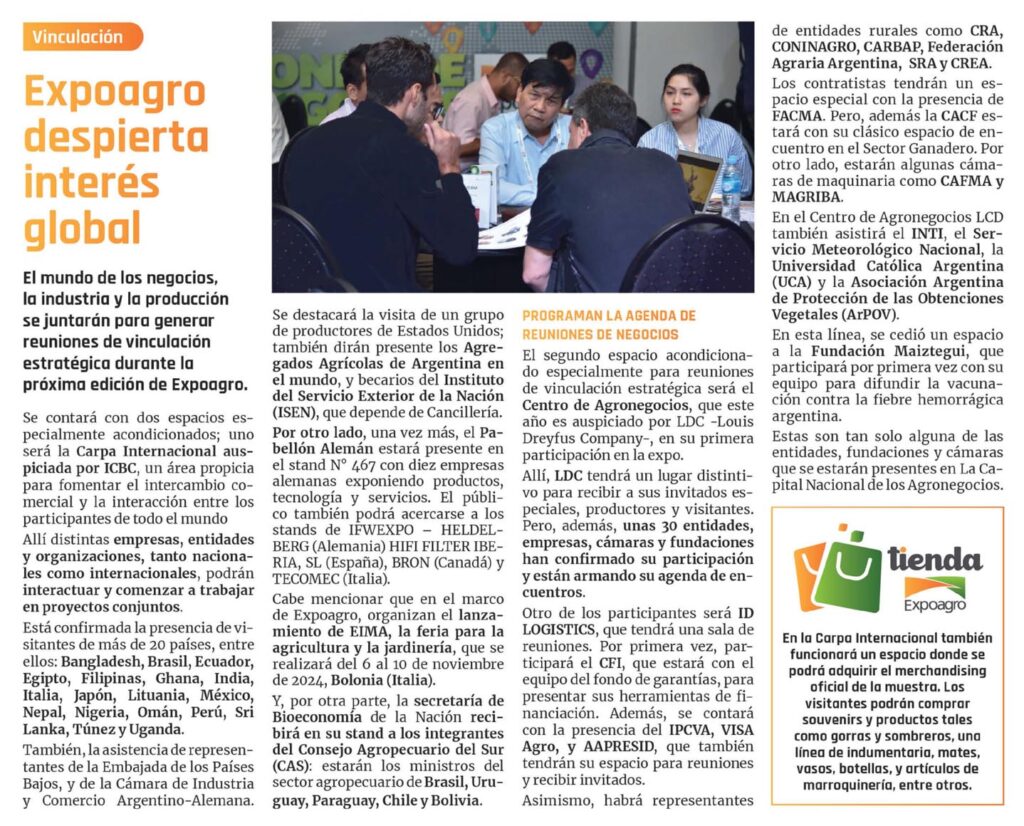 El mundo de los negocios, la industria y la producción se juntarán para generar reuniones de vinculación estratégica durante la próxima edición de Expoagro.Se contará con dos espacios especialmente acondicionados; uno será la Carpa Internacional auspiciada por ICBC, un área propicia para fomentar el intercambio comercial y la interacción entre los participantes de todo el mundo Allí distintas empresas, entidadesyor- ganizaciones, tanto nacionales como internacionales, podrán interactuar y comenzar a trabajar en proyectos conjuntos.Está confirmada la presencia de visitantes de más de 20 países, entre ellos: Bangladesh, Brasil, Ecuador, Egipto, Filipinas, Ghana, India, Italia, Japón, Lituania, México, Nepal, Nigeria, Omán, Perú, Sri Lanka, Túnez y Uganda.También, la asistencia de representantes de la Embajada de los Países Bajos, y de la Cámara de Industria y Comercio Argentino-Alemana. Se destacará la visita de un grupo de productores de Estados Unidos; también dirán presente los Agregados Agrícolas de Argentina en el mundo, y becarios del Instituto del Servicio Exterior de la Nación (ISEN), que depende de Cancillería.Por otro lado, una vez más, el Pabellón Alemán estará presente en el stand N° 467 con diez empresas alemanas exponiendo productos, tecnología y servicios. El público también podrá acercarse a los stands de IFWEXPO – HELDEL- BERG (Alemania) HIFI FILTER IBERIA, SL (España), BRON (Canadá) y TECO- MEC (Italia).Cabe mencionar que en el marco de Expoagro, organizan el lanzamiento de EIMA, la feria para la agricultura y la jardinería,que se realizarádelóalio de noviembre de 2024, Bolonia (Italia).Y, por otra parte, la secretaría de Bioe- conomía de la Nación recibirá en su stand a los integrantes del Consejo Agropecuario del Sur (CAS): estarán los ministros del sector agropecuario de Brasil, Uruguay, Paraguay, Chile y Bolivia.PROGRAMAN LA AGENDA DE REUNIONES DE NEGOCIOS El segundo espacio acondicionado especialmente para reuniones de vinculación estratégica será el Centro de Agro- negocios, que este año es auspiciado por LDC -Louis Dreyfus Company-, en su primera participación en la expo.Allí, LDC tendrá un lugar distintivo para recibir a sus invitados especiales, productores y visitantes. Pero, además, unas 30 entidades, empresas, cámaras y fundaciones han confirmado su participación y están armando su agenda de encuentros.Otro de los participantes será ID LOGIS- TICS, que tendrá una sala de reuniones. Por primera vez, participará el CFI, que estará con el equipo del fondo de garantías, para presentar sus herramientas de financiación. Además, se contará con la presencia del IPCVA, VISA Agro, y AAPRESID, que también tendrán su espacio para reuniones y recibir invitados.Asimismo, habrá representantes de entidades rurales como CRA, CONINA- GRO, CARBAP, Federación Agraria Argentina, SRAyCREA.Los contratistas tendrán un espacio especial con la presencia de FACMA. Pero, además la CACF estará con su clásico espacio de encuentro en el Sector Ganadero. Por otro lado, estarán algunas cámaras de maquinaria como CAFMA y MAGRIBA.En el Centro de Agronegocios LCD también asistirá el INTI, el Servicio Meteorológico Nacional, la Universidad Católica Argentina (UCA) y la Asociación Argentina de Protección de las Obtenciones Vegetales (ArPOV).En esta línea, se cedió un espacio a la Fundación Maiztegui, que participará por primera vez con su equipo para difundir la vacunación contra la fiebre hemorrágica argentina.Estas son tan solo alguna de las entidades, fundaciones y cámaras que se estarán presentes en La Capital Nacional de los Agronegocios.