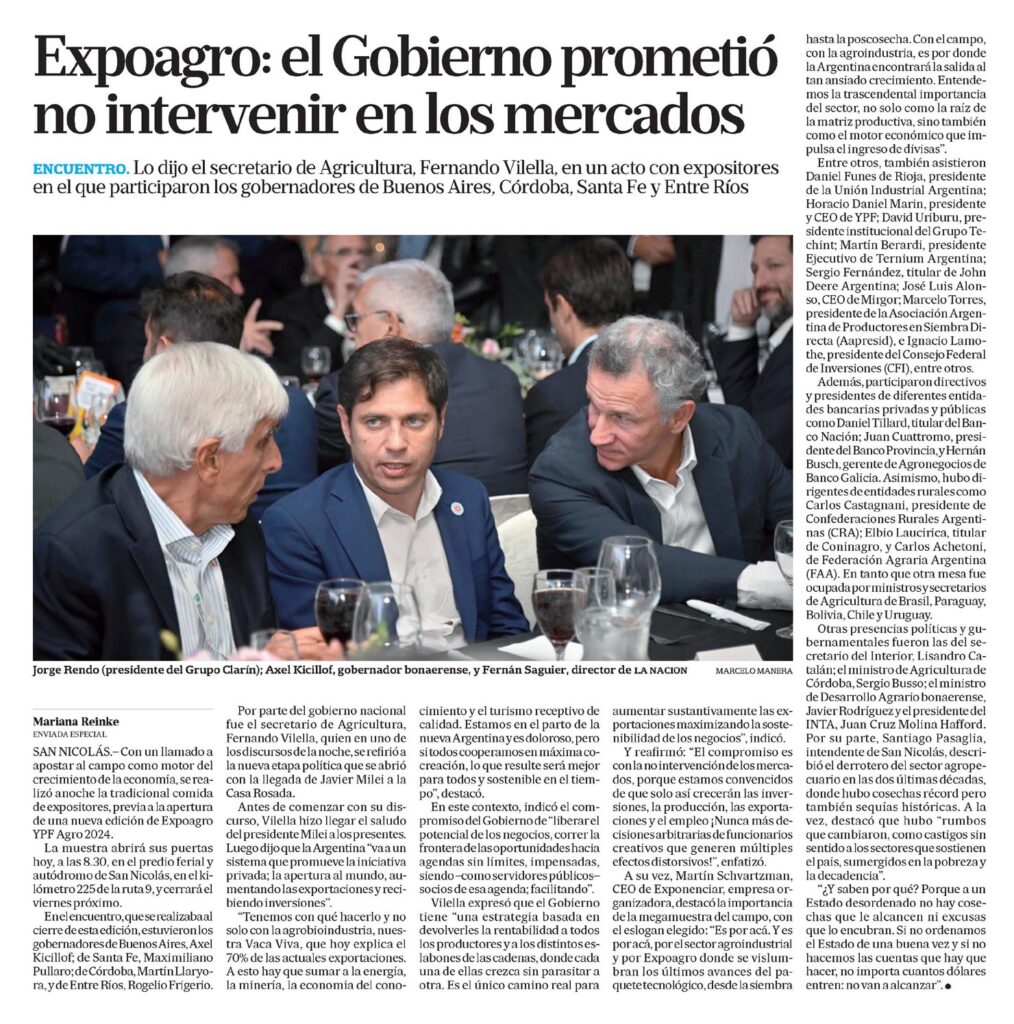 SAN NICOLÁS.? Con un llamado a apostar al campo como motor del crecimiento de la economía, se realizó anoche la tradicional comida de expositores, previa a la apertura de una nueva edición de Expoagro YPF Agro 2024.