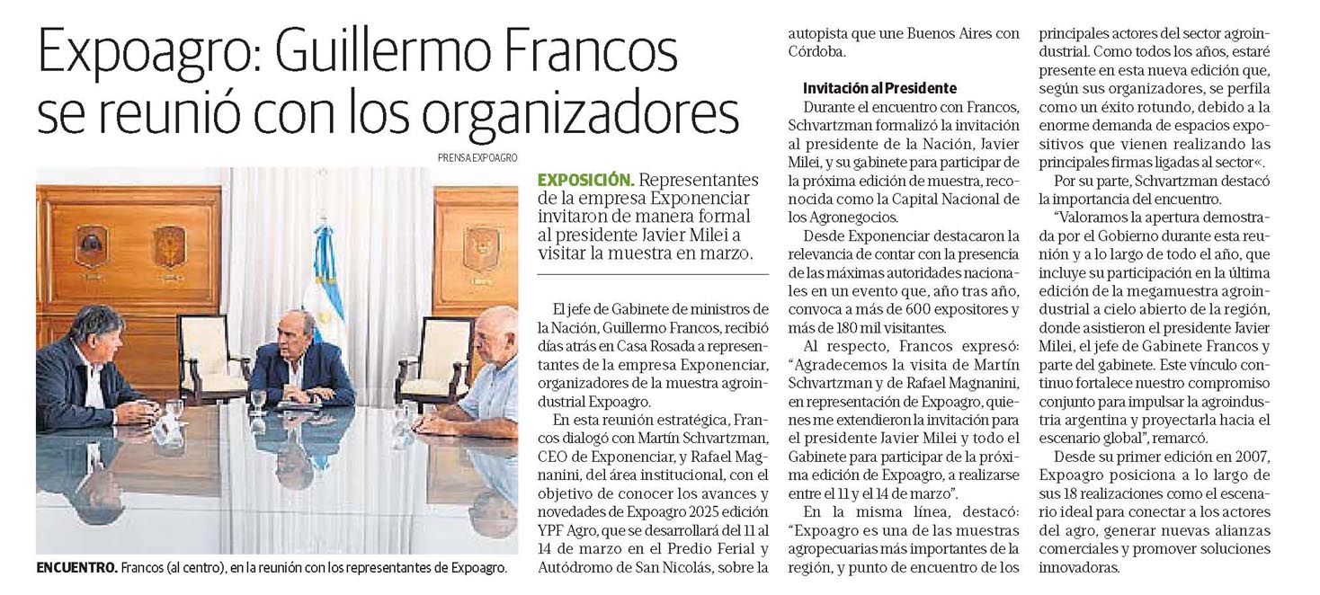 Al respecto, Francos expresó: «Agradecemos la visita de Martín Schvartzman y de Rafael Magnanini, en representación de Expoagro, quienes me extendieron la invitación para el presidente Javier Milei y todo el Gabinete para participar de la próxima edición de Expoagro, a realizarse entre el 11 y el 14 de marzo».