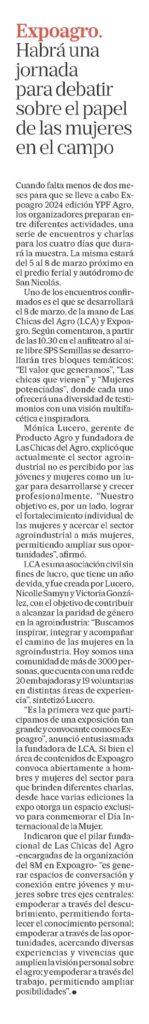 Cuando falta menos de dos meses para que se lleve a cabo Expoagro 2024 edición YPF Agro, los organizadores preparan entre diferentes actividades, una serie de encuentros y charlas para los cuatro días que durará la muestra. La misma estará del 5 al 8 de marzo próximo en el predio ferial y autódromo de San Nicolás.Uno de los encuentros confirmados es el que se desarrollará el 8 de marzo, de la mano de Las Chicas del Agro (LCA) y Expoagro. Según comentaron, a partir de las 10.30 en el anfiteatro al aire libre SPS Semillas se desarrollarán tres bloques temáticos: «El valor que generamos», «Las chicas que vienen» y «Mujeres potenciadas», donde cada uno ofrecerá una diversidad de testimonios con una visión multifa- cética e inspiradora.Mónica Lucero, gerente de Producto Agro y fundadora de Las Chicas del Agro, explicó que actualmente el sector agroin- dustrial no es percibido por las jóvenes y mujeres como un lugar para desarrollarse y crecer profesionalmente. «Nuestro objetivo es, por un lado, lograr el fortalecimiento individual de las mujeres y acercar el sector agroindustrial a más mujeres, permitiendo ampliar sus oportunidades», afirmó.LCA es una asociación civil sin fines de lucro, que tiene un año de vida, y fue creada por Lucero, Nicolle Samyn y Victoria González, con el objetivo de contribuir a alcanzar la paridad de género en la agroindustria: «Buscamos inspirar, integrar y acompañar el camino de las mujeres en la agroindustria. Hoy somos una comunidad de más de 3000 personas, que cuenta con una red de 20 embajadoras y 19 voluntarias en distintas áreas de experiencia», sintetizó Lucero.»Es la primera vez que participamos de una exposición tan grande y convocante como es Ex- poagro», anunció entusiasmada la fundadora de LCA. Si bien el área de contenidos de Expoagro convoca abiertamente a hombres y mujeres del sector para que brinden diferentes charlas, desde hace varias ediciones la expo otorga un espacio exclusivo para conmemorar el Día Internacional de la Mujer.Indicaron que el pilar fundacional de Las Chicas del Agro -encargadas de la organización del 8M en Expoagro– «es generar espacios de conversación y conexión entre jóvenes y mujeres sobre tres ejes centrales: empoderar a través del descubrimiento, permitiendo fortalecer el conocimiento personal; empoderar a través de las oportunidades, acercando diversas experiencias y vivencias que amplíen la visión personal sobre el agro; y empoderar a través del trabajo, permitiendo ampliar posibilidades».