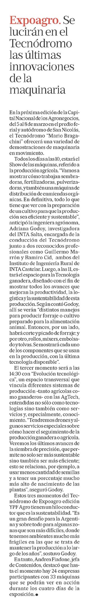 En definitiva, todo lo que tiene que ver con la preparación de un cultivo para que la producción sea eficiente y sustentable», anticipó la ingeniera agrónoma, Adriana Godoy, investigadora del iNTA Salta, encargada de la conducción del Tecnódromo junto a dos reconocidos profesionales como Guillermo Marrón y Ramiro Cid, ambos del instituto de ingeniería Rural de iNTA Castelar. Luego, a las 11, estará el espacio para la Tecnología ganadera, diseñado con el fin de mostrar todos los avances que mejoran la productividad, la logística y la sustentabilidad de esta producción. Según contó Godoy, allí se verán «distintos manejos para producir forraje o cultivo preparado para la alimentación animal. Entonces, por un lado, habrá corte y picado de forraje; y por otro, rollos, mixers, embolsado y tolvas. Se mostrará cada uno de los componentes que se usan en la producción, con la última tecnología disponible».