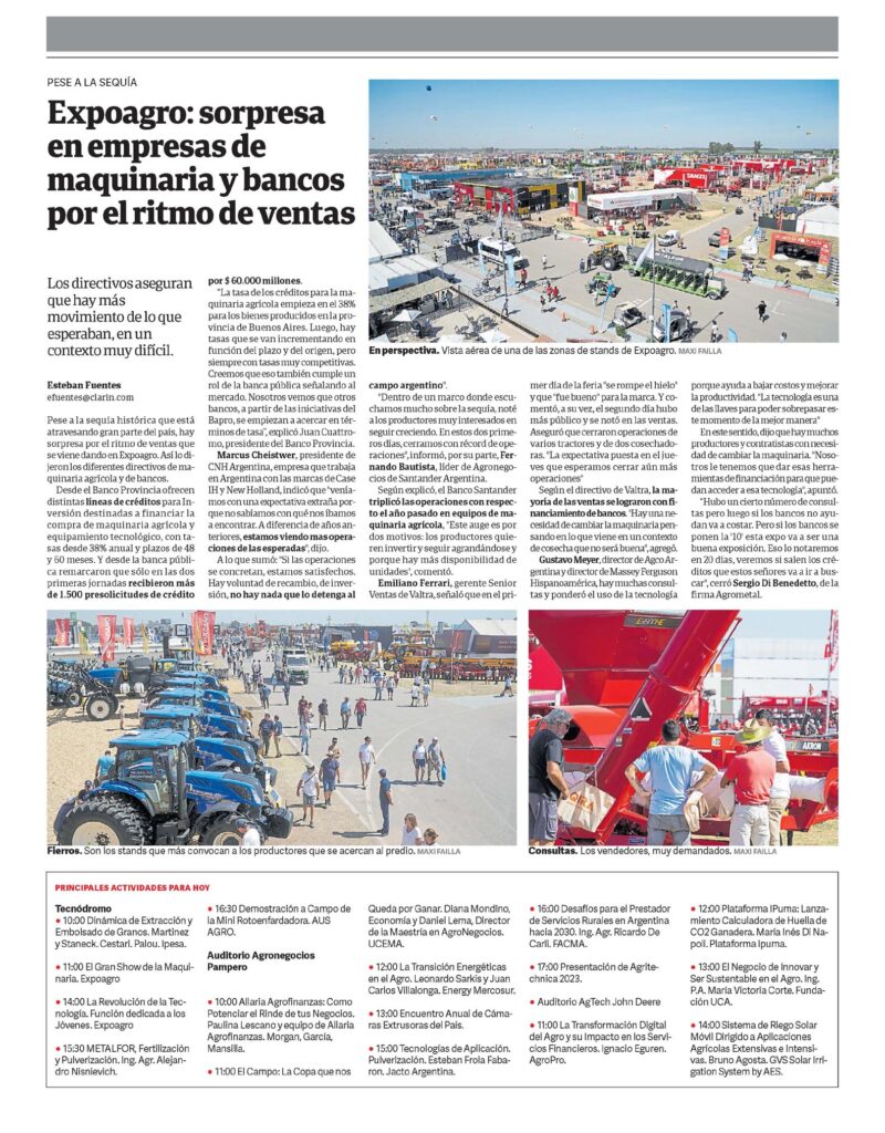 «La expectativa puesta en el jueves que esperamos cerrar aún más operaciones» Según el directivo de Valtra, la mayoría de las ventas se lograron con financiamiento de bancos. «Hay una necesidad de cambiar la maquinaria pensando en lo que viene en un contexto de cosecha que no será buena», agregó.