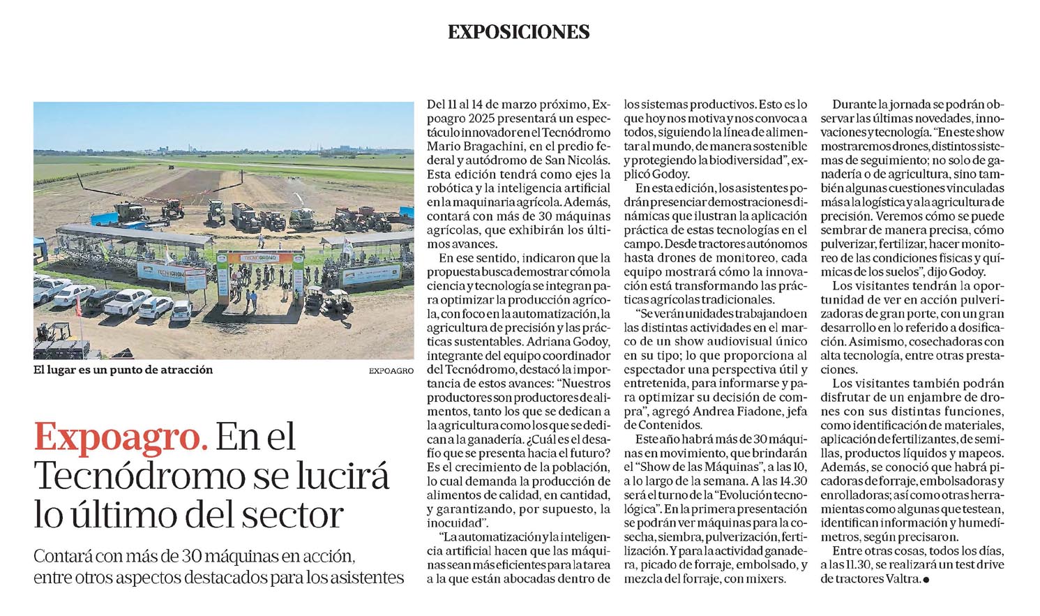 Del 11 al 14 de marzo próximo, Expoagro 2025 presentará un espectáculo innovador en el Tecnódromo Mario Bragachini, en el predio federal y autódromo de San Nicolás. Esta edición tendrá como ejes la robótica y la inteligencia artificial en la maquinaria agrícola. Además, contará con más de 30 máquinas agrícolas, que exhibirán los últimos avances.