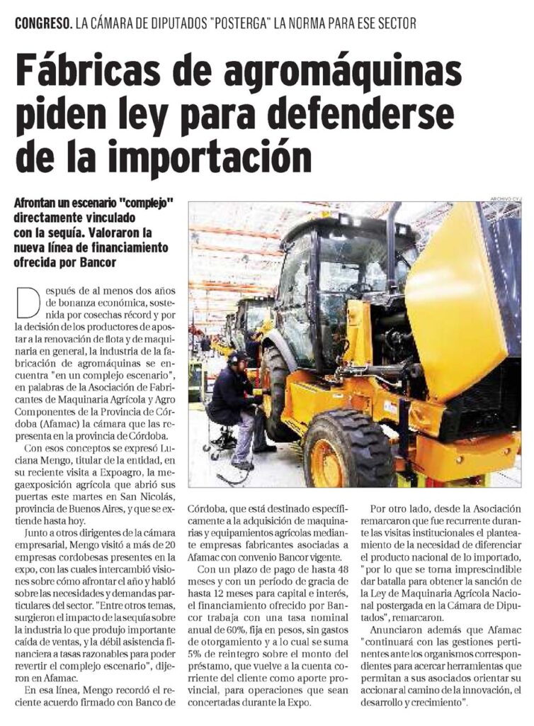 Después de al menos dos años de bonanza económica, sostenida por cosechas récord y por la decisión de los productores de apostar a la renovación de flota y de maquinaria en general, la industria de la fabricación de agromáquinas se encuentra «en un complejo escenario», en palabras de la Asociación de Fabricantes de Maquinaria Agrícola y Agro Componentes de la Provincia de Córdoba (Afamac) la cámara que las representa en la provincia de Córdoba.