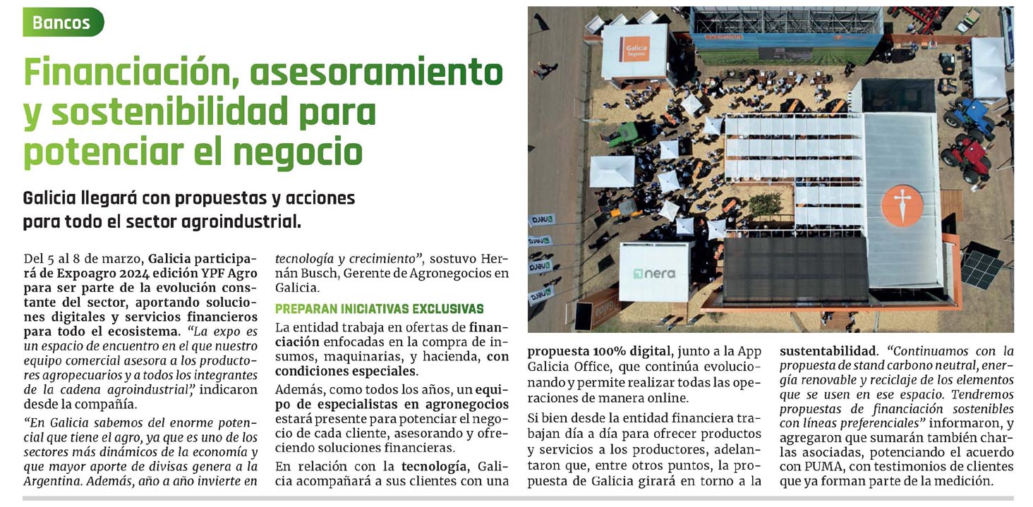 Galicia llegará con propuestas y acciones para todo el sector agroindustrial.Del 5 al 8 de marzo, Galicia participará de Expoagro 2024 edición YPF Agro para ser parte de la evolución constante del sector, aportando soluciones digitales y servicios financieros para todo el ecosistema. «La expo es un espacio de encuentro en el que nuestro equipo comercial asesora a los productores agropecuarios y a todos los integrantes de la cadena agroindustrial» indicaron desde la compañía.»En Galicia sabemos del enorme potencial que tiene el agro, ya que es uno de los sectores más dinámicos de la economía y que mayor aporte de divisas genera a la Argentina. Además, año a año invierte en tecnología y crecimiento», sostuvo Hernán Busch, Gerente de Agronegocios en Galicia.PREPARAN INICIATIVAS EXCLUSIVAS La entidad trabaja en ofertas de financiación enfocadas en la compra de insumos, maquinarias, y hacienda, con condiciones especiales.Además, como todos los años, un equipo de especialistas en agronegocios estará presente para potenciar el negocio de cada cliente, asesorando y ofreciendo soluciones financieras.En relación con la tecnología, Galicia acompañará a sus clientes con una ñera propuesta 100% digital, junto a la App Galicia Office, que continúa evolucionando y permite realizar todas las operaciones de manera Online.Si bien desde la entidad financiera trabajan día a día para ofrecer productos y servicios a los productores, adelantaron que, entre otros puntos, la propuesta de Galicia girará en torno a la sustentabilidad. «Continuamos con la propuesta de stand carbono neutral, energía renovable y reciclaje de los elementos que se usen en ese espacio. Tendremos propuestas de financiación sostenibles con líneas preferenciales» informaron, y agregaron que sumarán también charlas asociadas, potenciando el acuerdo con PUMA, con testimonios de clientes que ya forman parte de la medición.