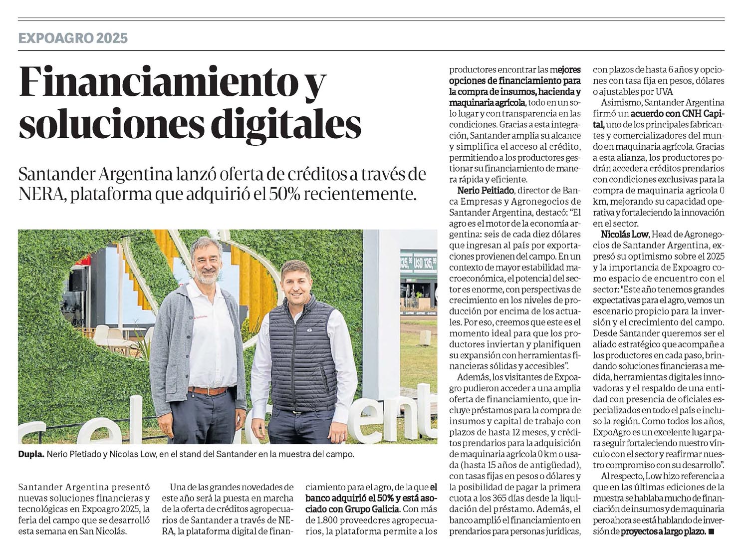 …Santander Argentina presentó nuevas soluciones financieras y tecnológicas en Expoagro 2025, la feria del campo que se desarrolló esta semana en San Nicolás. Una de las grandes novedades de este año será la puesta en marcha de la oferta…