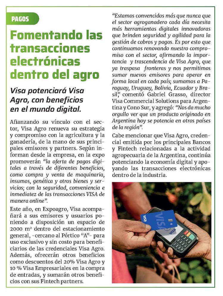 Afianzando su vínculo con el sector, Visa Agro renueva su estrategia y compromiso con la agricultura y la ganadería, de la mano de sus principales emisores y partners. Según informan desde la empresa, en la expo promoverán «la oferta de pagos digitales a través de diferentes beneficios, como compra y venta de maquinaria, insumos, genética y otros bienes y servicios; con la seguridad, conveniencia e inmediatez de las transacciones VISA de manera Online» Este año, en Expoagro, Visa acompañará a sus emisores y usuarios poniendo a disposición un espacio de 2000 m2 dentro del estacionamiento general, -cercano al Pórtico «A»- para uso exclusivo y sin costo para beneficiarios de las credenciales Visa Agro. Además, ofrecerán otros beneficios como descuentos del 20% Visa Agro y 10 % Visa Empresariales en la compra de entradas, y sumarán otros beneficios con sus Fintech partners. «Estamos convencidos más que nunca que el sector agroganadero cada día necesita más herramientas digitales innovadoras que brinden seguridad y agilidad para la gestión de cobros y pagos. Es por esto que continuamos renovando nuestro compromiso con el sector, afirmando la importancia y trascendencia de Visa Agro, que ya traspasa fronteras y nos permitimos sumar nuevos emisores para operar en forma local en cada país; sumamos a Paraguay, Uruguay, Bolivia, Ecuador y Brasil’’ comentó Gabriel Grasso, director Visa Commercial Solutions para Argentina y Cono Sur, y agregó: «Nos da mucho orgullo ver que un producto originado en Argentina hoy se potencia en otros países de la región».
