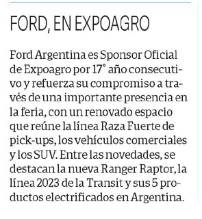 Ford Argentina es Sponsor Oficial de Expoagro por 17° año consecutivo y refuerza su compromiso a través de una importante presencia en la feria, con un renovado espacio que reúne la línea Raza Fuerte de pick-ups, los vehículos comerciales y los SUV. Entre las novedades, se destacan la nueva Ranger Raptor, la línea 2023 de la Transit y sus 5 productos electrificados en Argentina.