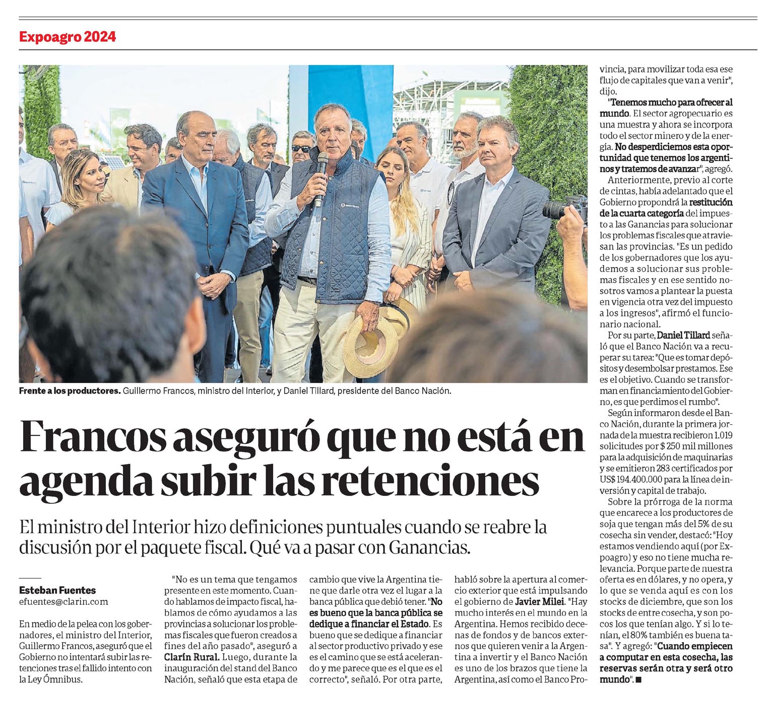 El ministro del Interior hizo definiciones puntuales cuando se reabre la discusión por el paquete fiscal. Qué va a pasar con Ganancias.Frente a los productores. Guillermo Francos, ministro del Interior, y Daniel Tillard, presidente del Banco Nación.En medio de la pelea con los gobernadores, el ministro del Interior, Guillermo Francos, aseguró que el Gobierno no intentará subir las retenciones tras el fallido intento con la Ley Ómnibus.»No es un tema que tengamos presente en este momento. Cuando hablamos de impacto fiscal, hablamos de cómo ayudamos a las provincias a solucionar los problemas fiscales que fueron creados a fines del año pasado», aseguró a Clarín Rural. Luego, durante la inauguración del stand del Banco Nación, señaló que esta etapa de cambio que vive la Argentina tiene que darle otra vez el lugar a la banca pública que debió tener. «No es bueno que la banca pública se dedique a financiar el Estado. Es bueno que se dedique a financiar al sector productivo privado y ese es el camino que se está acelerando y me parece que es el que es el correcto», señaló. Por otra parte, habló sobre la apertura al comercio exterior que está impulsando el gobierno de Javier Milei. «Hay mucho interés en el mundo en la Argentina. Hemos recibido decenas de fondos y de bancos externos que quieren venir a la Argentina a invertir y el Banco Nación es uno de los brazos que tiene la Argentina, así como el Banco Proactovincia, para movilizar toda esa ese flujo de capitales que van a venir», dijo.»Tenemos mucho para ofrecer al mundo. El sector agropecuario es una muestra y ahora se incorpora todo el sector minero y de la energía.No desperdiciemos esta oportunidad que tenemos los argentinos y tratemos de avanzar», agregó.Anteriormente, previo al corte de cintas, había adelantado que el Gobierno propondrá la restitución de la cuarta categoría del impuesto a las Ganancias para solucionar los problemas fiscales que atraviesan las provincias. «Es un pedido de los gobernadores que los ayudemos a solucionar sus problemas fiscales y en ese sentido nosotros vamos a plantear la puesta en vigencia otra vez del impuesto a los ingresos», afirmó el funcionario nacional.Por su parte, Daniel Tillard señaló que el Banco Nación va a recuperar su tarea: «Que es tomar depósitos y desembolsar prestamos. Ese es el objetivo. Cuando se transforman en financiamiento del Gobierno, es que perdimos el rumbo».Según informaron desde el Banco Nación, durante la primera jornada de la muestra recibieron 1.019 solicitudes por $ 250 mil millones para la adquisición de maquinarias y se emitieron 283 certificados por US$ 194.400.000 para la línea de inversión y capital de trabajo.Sobre la prórroga de la norma que encarece a los productores de soja que tengan más del 5% de su cosecha sin vender, destacó: «Hoy estamos vendiendo aquí (por Expoagro) y eso no tiene mucha relevancia.Porque parte de nuestra oferta es en dólares, y no opera, y lo que se venda aquí es con los stocks de diciembre, que son los stocks de entre cosecha, y son pocos los que tenían algo. Y si lo tenían, el 80% también es buena tasa».Y agregó: «Cuando empiecen a computar en esta cosecha, las reservas serán otra y será otro mundo»