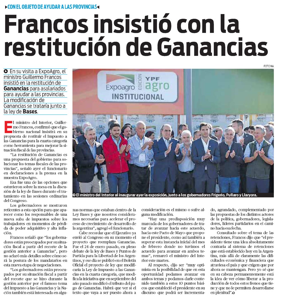 En su visita a ExpoAgro, el ministro Guillermo Francos insistió en la restitución de Ganancias para asalariados para ayudar a las provincias. La modificación de Ganancias se trataría junto a la ley de Bases.El ministro del Interior, Guillermo Francos, confirmó que el gobierno nacional insistirá en su propuesta de restituir el Impuesto a las Ganancias para la cuarta categoría como herramienta para mejorar la situación fiscal de las provincias.»La restitución de Ganancias es una propuesta del gobierno para solucionar los temas fiscales de las provincias», señaló ayer el funcionario en declaraciones a la prensa en la muestra ExpoAgro.Esa fue una de las opciones que estuvieron sobre la mesa en la discusión de la ley de Bases durante el tratamiento en las sesiones ordinarias del Congreso.Los gobernadores se mostraron reticentes a esta opción para que aparecer como los responsables de una nueva suba de impuestos sobre los trabajadores en momentos de pérdida de poder adquisitivo y alta inflación.Francos señaló que «los gobernadores están preocupados por su situación fiscal a partir del recorte de la gestión anterior a Ganancias», pero no aclaró más detalles sobre cómo será la postura de los mandatarios en esta nueva etapa de negociaciones.»Los gobernadores están preocupados por su situación fiscal a partir del recorte que se hizo durante la gestión anterior por el famoso tema del impuesto a las Ganancias y la Nación también está interesada en algunas normas que estaban dentro de la Ley Bases y que nosotros consideramos necesarias para acelerar el proceso de crecimiento de desarrollo de la argentina», agregó el funcionario.Cabe recordar que el Ejecutivo ya envió al Congreso en su momento el proyecto que reemplaza Ganancias.Fue el 24 de enero pasado, en pleno debate de la ley de Bases y Puntos de Partida para la Libertad de los Argentinos, y ese día se publicó en el Boletín Oficial el proyecto de ley que modificaría la Ley de Impuesto a las Ganancias en la cuarta categoría, que modifica la iniciativa que en septiembre del año pasado modificó el tributo del pago de Ganancias. Habrá que ver si el texto que vaya a ser puesto ahora a consideración es el mismo o sufre alguna modificación.»Hay una predisposición muy marcada de los gobernadores de tratar de avanzar hacia este acuerdo, hacia este Pacto de Mayo que propone el presidente, como así también a superar esta instancia inicial del mes de febrero donde no tuvimos el acuerdo para avanzar en ambos temas», remarcó el ministro del Interior este martes.Al respecto, dijo ser «muy optimista en la posibilidad de que en esta oportunidad podamos avanzar en ambos temas y podamos darle contenido también a estos 10 puntos básicos que estableció el presidente en su discurso que podrá ser incrementado, agrandado, complementado por las propuestas de los distintos actores de la política, gobernadores, legisladores, líderes partidarios en el camino hacia esa fecha.Consultado sobre el tema de las retenciones, Francos dijo que «el presidente tiene una idea absolutamente contraria al sistema de retenciones que está establecido hoy en la Argentina, más allá de claramente las dificultades económica y financiera que atraviesa el país y que exigen que por ahora se mantengan. Pero yo sé que en su cabeza permanentemente está la idea de ver cómo liberar a la producción de todos estos frenos que tiene y que no le permiten desarrollarse en plenitud».El ministro del Interior al inaugurar ayer la exposición, junto a los gobernadores Frigerio, Pullaro y Llaryora