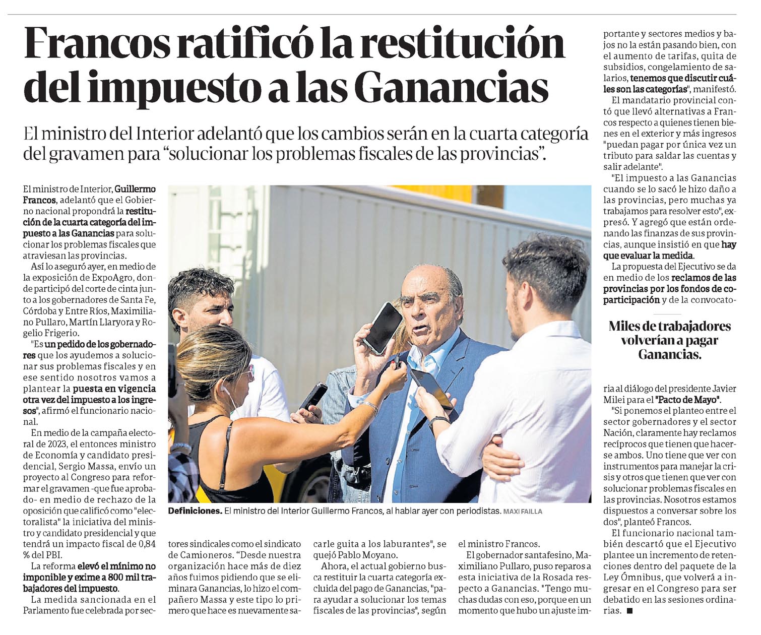 El ministro de Interior, Guillermo Francos, adelantó que el Gobierno nacional propondrá la restitución de la cuarta categoría del impuesto a las Ganancias para solucionar los problemas fiscales que atraviesan las provincias.