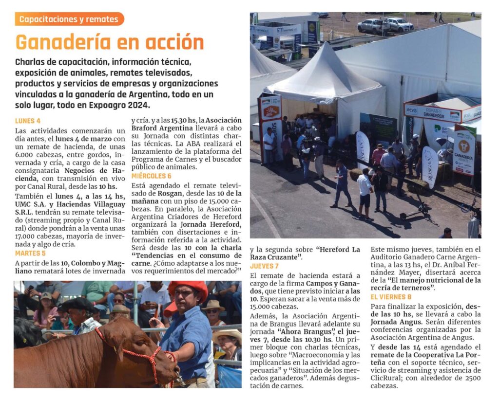 Charlas de capacitación, información técnica, exposición de animales, remates televisados, productos y servicios de empresas y organizaciones vinculadas a la ganadería de Argentina, todo en un solo lugar, todo en Expoagro 2024.lunes 4 Las actividades comenzarán un día antes, el lunes 4 de marzo con un remate de hacienda, de unas 6.000 cabezas, entre gordos, invernada y cría, a cargo de la casa consignataria Negocios de Hacienda, con transmisión en vivo por Canal Rural, desde las 10 hs. También el lunes 4, a las 14 hs, UMC S.A. y Haciendas Villaguay S.R.L. tendrán su remate televisado (streaming propio y Canal Rural) donde pondrán a la venta unas 17.000 cabezas, mayoría de invernada y algo de cría.MARTES 5 A partir de las 10, Colombo y Maglia- no rematará lotes de invernada y cría, y a las 15.30 hs, la Asociación Braford Argentina llevará a cabo su Jornada con distintas charlas técnicas. La ABA realizará el lanzamiento de la plataforma del Programa de Carnes y el buscador público de animales. MIÉRCOLES 6 Está agendado el remate televisado de Rosgan, desde las 10 de la mañana con un piso de 15.000 cabezas. En paralelo, la Asociación Argentina wnaderos Ik -, j – ■L , ■ *ro 1 © 1 I Can*°er,a 1 ii – l Ü r n ■hhüí ?i ‘ M-‘í1 Criadores de Hereford organizará la Jornada Hereford, también con disertaciones e información referida a la actividad. Será desde las 10 con la charla «Tendencias en el consumo de carne. ¿Cómo adaptarse a los nuevos requerimientos del mercado?» y la segunda sobre «Hereford La Raza Cruzante».JUEVES 7 El remate de hacienda estará a cargo de la firma Campos y Ganados, que tiene previsto iniciar a las 10. Esperan sacar a la venta más de 15.000 cabezas.Además, la Asociación Argentina de Brangus llevará adelante su jornada «Ahora Brangus?,? el jueves 7, desde las 10.30 hs. Un primer bloque con charlas técnicas, luego sobre «Ma- croeconomía y las implicancias en la actividad agropecuaria» y «Situación de los mercados ganaderos». Además degustación de carnes.Este mismo jueves, también en el Auditorio Ganadero Carne Argentina, a las 13 hs, el Dr. Aníbal Fernández Ma- yer, disertará acerca de la «El manejo nutricional de la recría de terneros». EL VIERNES 8 Para finalizar la exposición, desde las 10 hs, se llevará a cabo la Jornada Angus. Serán diferentes conferencias organizadas por la Asociación Argentina de Angus.Y desde las 14 está agendado el remate de la Cooperativa La Porteña con el soporte técnico, servicio de streaming y asistencia de ClicRural; con alrededor de 2500 cabezas.