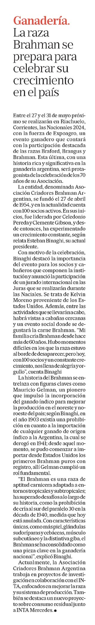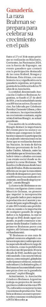 Con motivo de la celebración, Binaghi destacó la importancia del evento para los socios y cabañeros que componen la institución y anunció la participación de unjurado internacional en las Juras que se realizarán durante las Naciales. Se trata de Kelvin Moreno proveniente de los Estados Unidos. Además, entre las actividades que se llevarán a cabo, habrá vistas a cabañas cercanas y un evento social donde se degustará la carne Brahman. «Mi familia cría Brahman desde hace más de 60 años. Hubo momentos difíciles en los que la raza estuvo al borde de desaparecer, pero hoy, con 100 socios y un constante crecimiento, nos llena de alegría y orgullo», cuenta Binaghi La historia del Brahman se entrelaza con figuras claves como Mauricio Gelman, un pionero que impulsó la incorporación del ganado índico para mejorar la producción en el noreste y noroeste del pais; según Binaghi, en el año 1903 existía una prohibición en cuanto a la importación de cualquier ganado de origen índico a la Argentina, la cual se derogó en 1941; desde aquel momento, se pudo comenzar a importar desde Estados Unidos los primeros Brahman puros con registro, allí Gelman cumplió un rol fundamental.