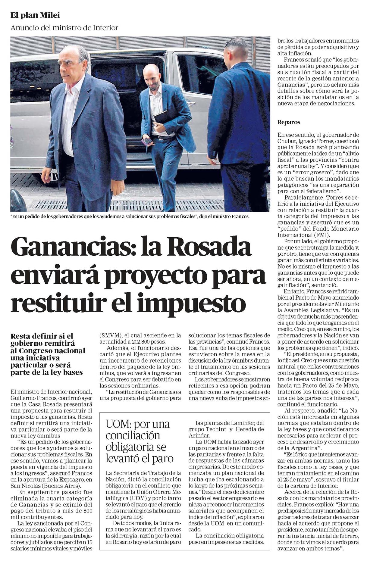 “Es un pedido de los gobernadores que los ayudemos a solucionar sus problemas fiscales”, dijo el ministro Francos.Ganancias: la Rosada enviará proyecto para restituir el impuestoResta definir si el gobierno remitiráal Congreso nacional una iniciativa particular o será parte de la ley basesEl ministro de Interior nacional, Guillermo Francos, confirmó ayer que la Casa Rosada presentará una propuesta para restituir el impuesto a las ganancias. Resta definir si remitirá una iniciativa particular o será parte de la hueva ley ómnibus“Es un pedido de los gobernadores que los ayudemos a solucionarsus problemas fiscales. En ese sentido, vamos a plantear la puesta en vigencia del impuesto alosingresos”, aseguró Francos en la apertura de la Expoagro, en San Nicolás (Buenos Aires).En septiembre pasado fue eliminada la cuarta categoría de Ganancias y se eximió del pago del tributo a más de 800 mil contribuyentes.La ley sancionada por el Congreso nacional elevaba el piso del mínimo no imponible para trabajadores y jubilados que perciban 15 salarios mínimos vitales y móviles(SMVM), el cual asciende en la actualidad a 202.800 pesos.Además, el funcionario descartó que el Ejecutivo plantee un incremento de retenciones dentro del paquete de la ley ómnibus, que volverá a ingresar en el Congreso para ser debatido en las sesiones ordinarias.“La restitución de Ganancias es Una propuesta del gobierno parolucionar los temas fiscales de las provincias”, continuó Francos. Esa fue una de las opciones que estuvieron sobre la mesa en la discusión dela ley ómnibus durante el tratamiento en las sesiones ordinarias del Congreso.Los gobernadores se mostraron reticentes a esa opción: podrían quedar como los responsables de una nueva suba de impuestos so-UOM: por una conciliación obligatoria se levantó el paroLa Secretaría de Trabajo de la Nación, dictó la conciliación obligatoria en el conflicto que mantiene la Unión Obrera Metalúrgica (UOM) y por lo tanto selevantó el paro que el gremio delos metalúrgicos había anunciado para hoy.Detodos modos, la única rama que no levantará el paro es la siderurgia, razón por la cual en Rosario hoy estarán de paras plantas de Lamintfer, del grupo Techint y Heredia de Acindar.La UOM había lanzado ayer un paro nacional enel marco de las paritarias y frente a la falta de respuestas de las cámaras empresarias. De este modo comenzaba un plan nacional de lucha que iba escalonando a lo largo de las próximas semanas. “Desde el mes de diciembre pasado el sector empresario se niega a reconocer incrementos salariales que acompañen el índice de inflación”, explicaron desde la UOM en un comunicado.La conciliación obligatoria puso en impasse estas medidas.bre los trabajadores en momentos de pérdida de poder adquisitivo y alta inflación.Francos señaló que “los goberhadores están preocupados por su situación fiscal a partir del recorte de la gestión anterior a Ganancias”, pero no aclaró más detalles sobre cómo será la posición de los mandatarios en la hueva etapa de negociaciones.ReparosEn ese sentido, el gobernador de Chubut, Ignacio Torres, cuestionó que la Rosada esté planteando públicamente laidea deun “alivio fiscal” a las provincias “contra aprobar una ley”. Y considero que es un “error grosero”, dado que lo que buscan los mandatarios patagónicos “es una reparación para con el federalismo”.Paralelamente, Torres se refirió a la iniciativa del Ejecutivo con relación a restituir la cuarta categoría del impuesto a las ganancias y aseguró que es un “pedido” del Fondo Monetario Internacional (FMD.Por un lado, el gobierno propohe queseretrotraiga la medida y, porotro, tiene que ver con quienes ganan más con distintas variables. Noes lo mismo el impuesto a las ganancias antes que lo que puede ser ahora, en un contexto de megainflación”, sentenció.Entanto, Francos se refirió también al Pacto de Mayo anunciado porel presidente Javier Milei ante la Asamblea Legislativa. “Es un objetivode mucha más trascendencia que todo lo que tengamos en el medio. Creo que, en ese camino, los gobernadores y la Nación se van a poner de acuerdo en solucionar los problemas que tienen”, indicó.“El presidente, en su propuesta, lodijo así. Creo quees una cuestión hatural que, enlas conversaciones conlos gobernadores, como muestra de buena voluntad recíproca hacia un Pacto del 25 de Mayo, tratemos los temas que a cada una de las partes nos interesa”, continuó el funcionario.Al respecto, añadió: “La Nación está interesada en algunas normas que estaban dentro de la ley bases y que consideramos necesarias para acelerar el proceso de desarrollo y crecimiento de la Argentina”.“Es lógico que intentemos avanzar en ambas normas, tanto las fiscales como la ley bases, y que tengan tratamiento en el camino al 25de mayo”, sostuvo el titular de la cartera de Interior.Acerca dela relación de la Rosada con los mandatarios provinciales, Francos explicó: “Hay una predisposición muy marcada delos gobernadores de tratar de avanzar hacia el acuerdo que propone el presidente, como también de superar la instancia inicial de febrero, donde no tuvimos el acuerdo para avanzar en ambos temas”.