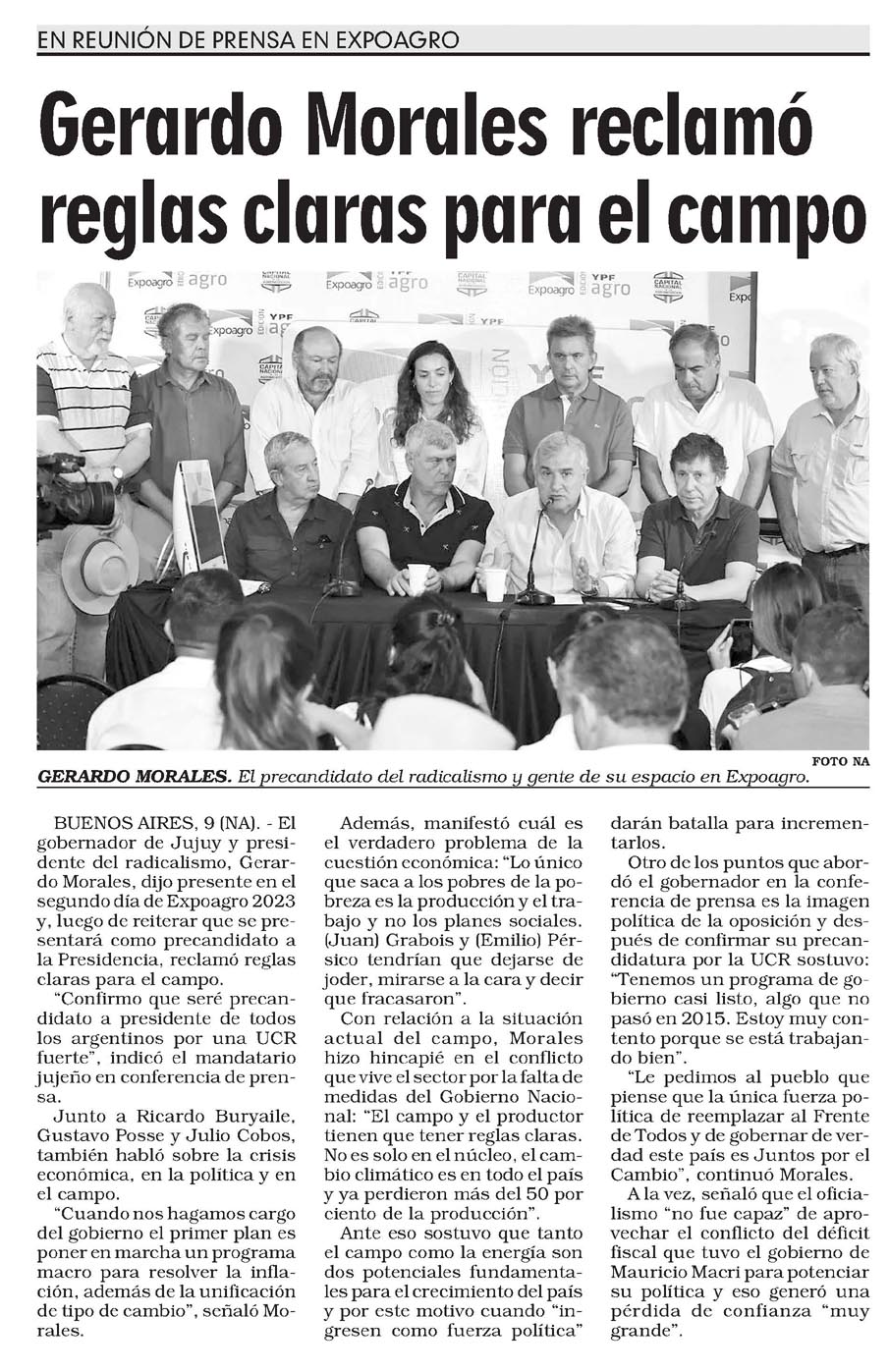 BUENOS AIRES, 9 (NA). – El gobernador de Jujuy y presidente del radicalismo, Gerardo Morales, dijo presente en el segundo día de Expoagro 2023 y, luego de reiterar que se presentará como precandidato a la Presidencia, reclamó reglas claras para el campo.